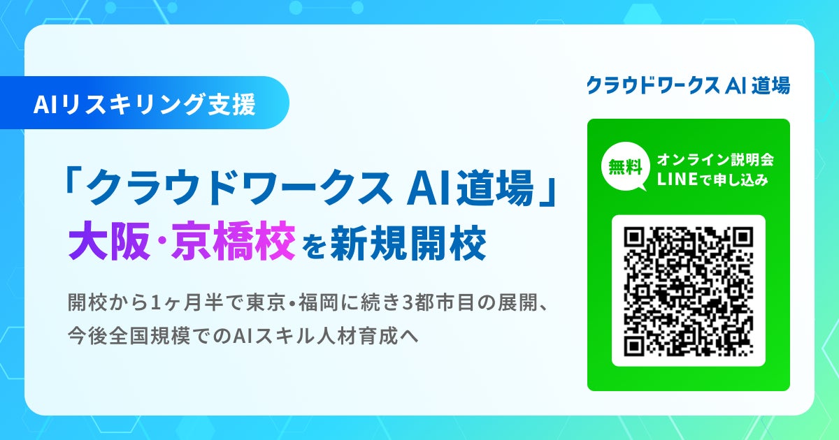 企業と個人をつなぐオンライン人材マッチング事業を展開する株式会社クラウドワークス(本社:東京都渋谷区 代表取締役社長 兼 CEO:吉田 浩一郎 以下「当社」)の100%子会社で、AI事業を展開する株式会社AI techは、2024年7月にAIスキルに特化したリスキリングサービス「クラウドワークス AI道場」の新規校舎として「クラウドワークス AI道場 京橋校」(所在地:大阪府大阪市)を開校いたしましたのでお知らせします。