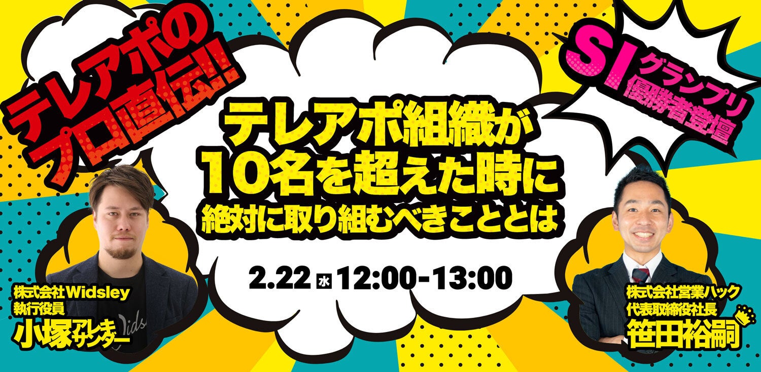 株式会社営業ハック(本社:東京都港区・代表:笹田裕嗣)と株式会社Widsley(本社:東京都渋谷区・代表:髙橋弘考)が共催ウェビナーを行います。日時は2023年2月22日(水)12:00~13:00、参加費は無料です。長年の営業手法であるテレアポですが、テレアポマネジメントに苦労している会社は少なくありません。そこでテレアポマネジメントに焦点をあて、現場が疲弊せず、かつ成果が出るテレアポの極意について解説していきます。