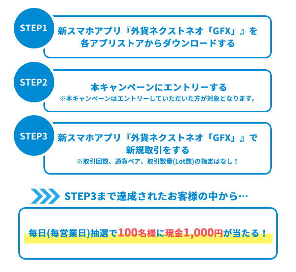 本キャンペーンにエントリーのうえ、新スマホアプリ『外貨ネクストネオ「GFX」』にて対象期間中に新規注文のお取引をされたお客様の中から毎日(毎営業日)抽選で100名様に現金1,000円をプレゼントいたします。
