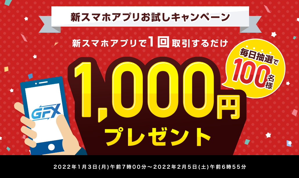 株式会社外為どっとコム(本社:東京都港区、代表取締役社長:竹内 淳)は、店頭FX『外貨ネクストネオ』にて、新スマホアプリ『外貨ネクストネオ「GFX」』を利用して初めて新規注文のお取引をされた方を対象に、毎日(毎営業日)抽選で100名様に現金1,000円が当たるキャンペーンを2022年1月3日(月)より実施します。