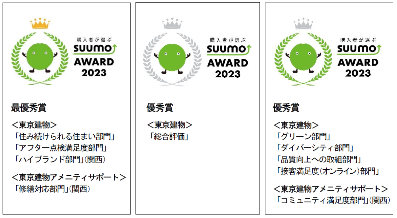 東京建物グループは、株式会社リクルート(本社:東京都千代田区、代表取締役社長:北村 吉弘)が発表した『SUUMO AWARD 2023』 において、東京建物が《分譲マンションデベロッパー・販売会社の部》の「住み続けられる住まい部門」、「アフター点検満足度部門」、「ハイブランド部門」(関西)で最優秀賞を受賞、また、東京建物アメニティサポートが昨年の総合評価最優秀賞(分譲マンション管理会社の部 首都圏版)に続き、今年は《分譲マンション管理会社の部 関西版》の「修繕対応部門」で最優秀賞を受賞しました。