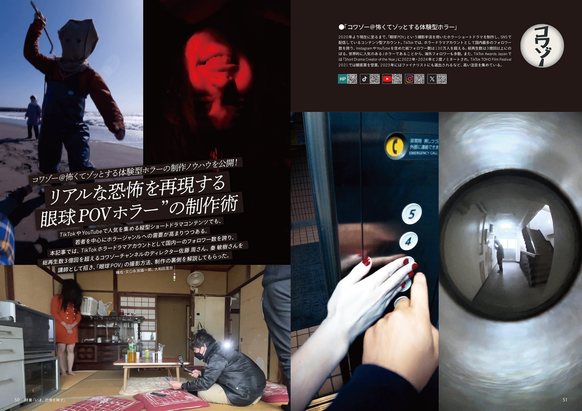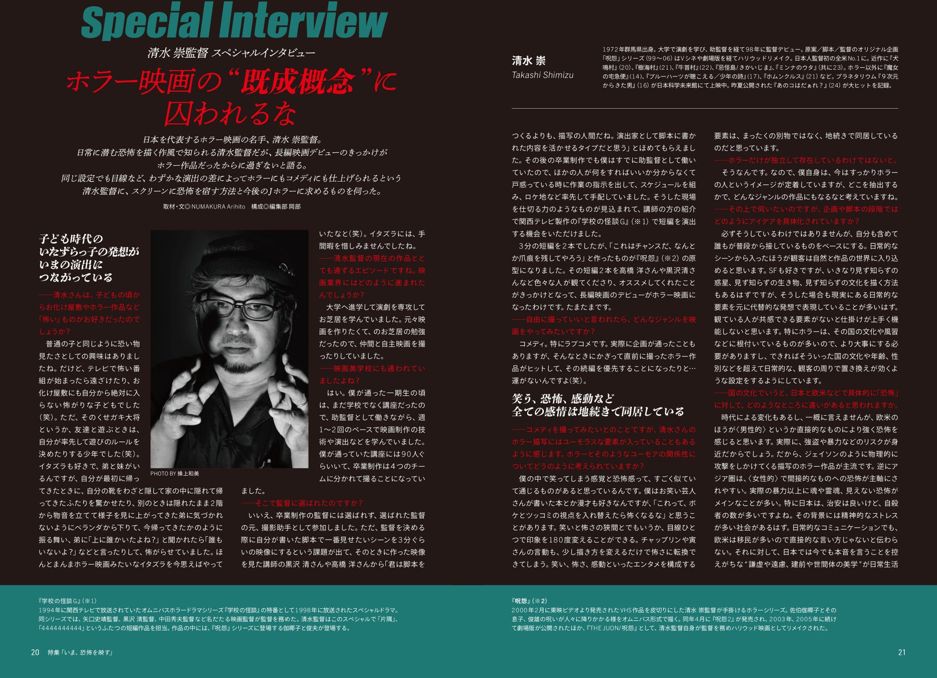 特集の冒頭では、『呪怨』など数多くのホラー映画を手がけるJホラーの名手、清水崇監督のSPインタビューを掲載。 清水監督がどのように恐怖と向き合ってきたのかという話から、現代のJホラーに思うことまで、ここでしか聞けない話が満載だ。