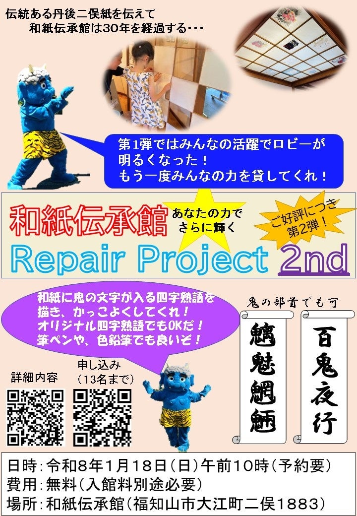 【内容】丹後二俣紙製の障子紙に鬼にまつわる文字を描き、障子を修復。