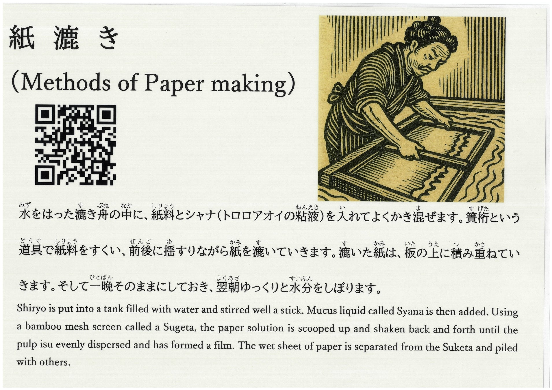 【内容】和紙ができるまでの工程の説明文をリニューアルし、英語表記も追加。QRコードで作業工程の動画も紹介
