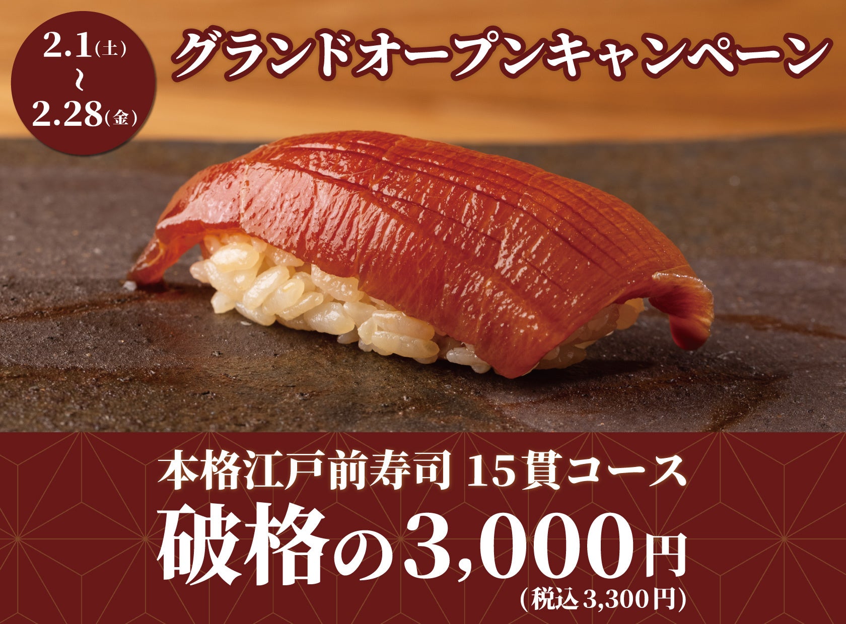 株式会社ビリオンフーズ(本社:東京都品川区 代表:中村雄斗)が運営する『日本橋 すし処 二ノ宮 上野店』では、2月1日(土)〜2月28日(金)の期間中、本格江戸前寿司15貫コースを3,300円(税込)でお楽しみいただけるキャンペーンを開催いたします。