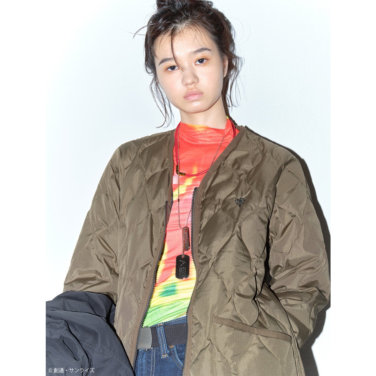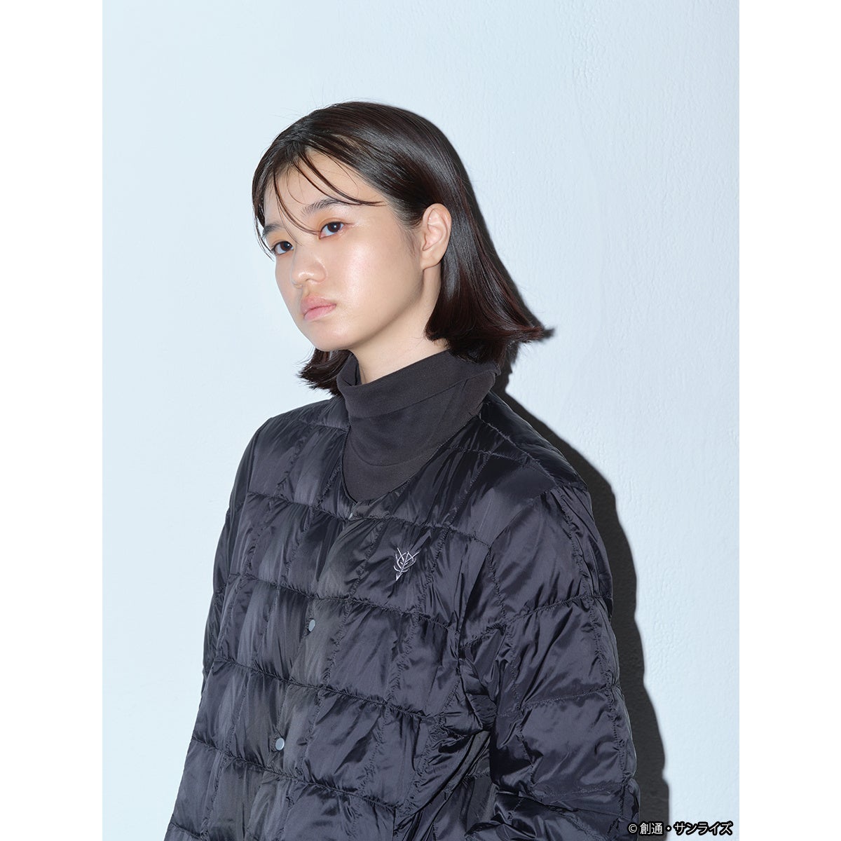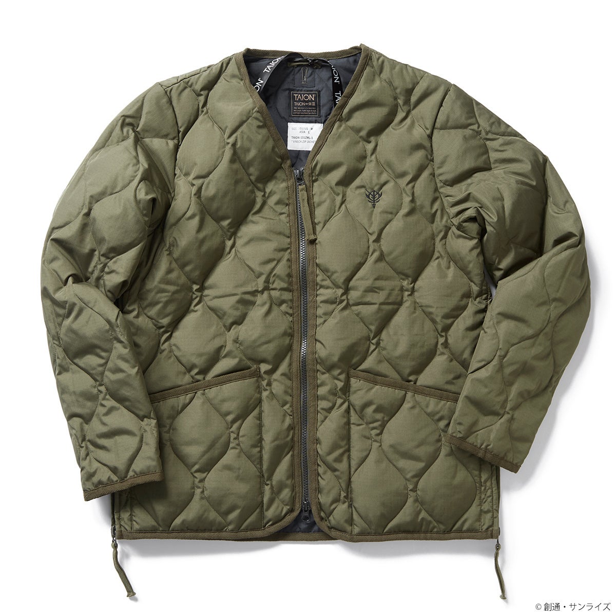脇のベンチレーションや大きなフロントポケットなど、ミリタリーテイストのディティールも魅力的なミリタリージップインナーダウンは、軽く反発力に優れた800flp以上の良質なダウンを封入し、1枚でも温かいダウンです。左胸にはジオン軍マークのワンポイント刺繍を施しました。インナーダウン用収納袋も付属します。