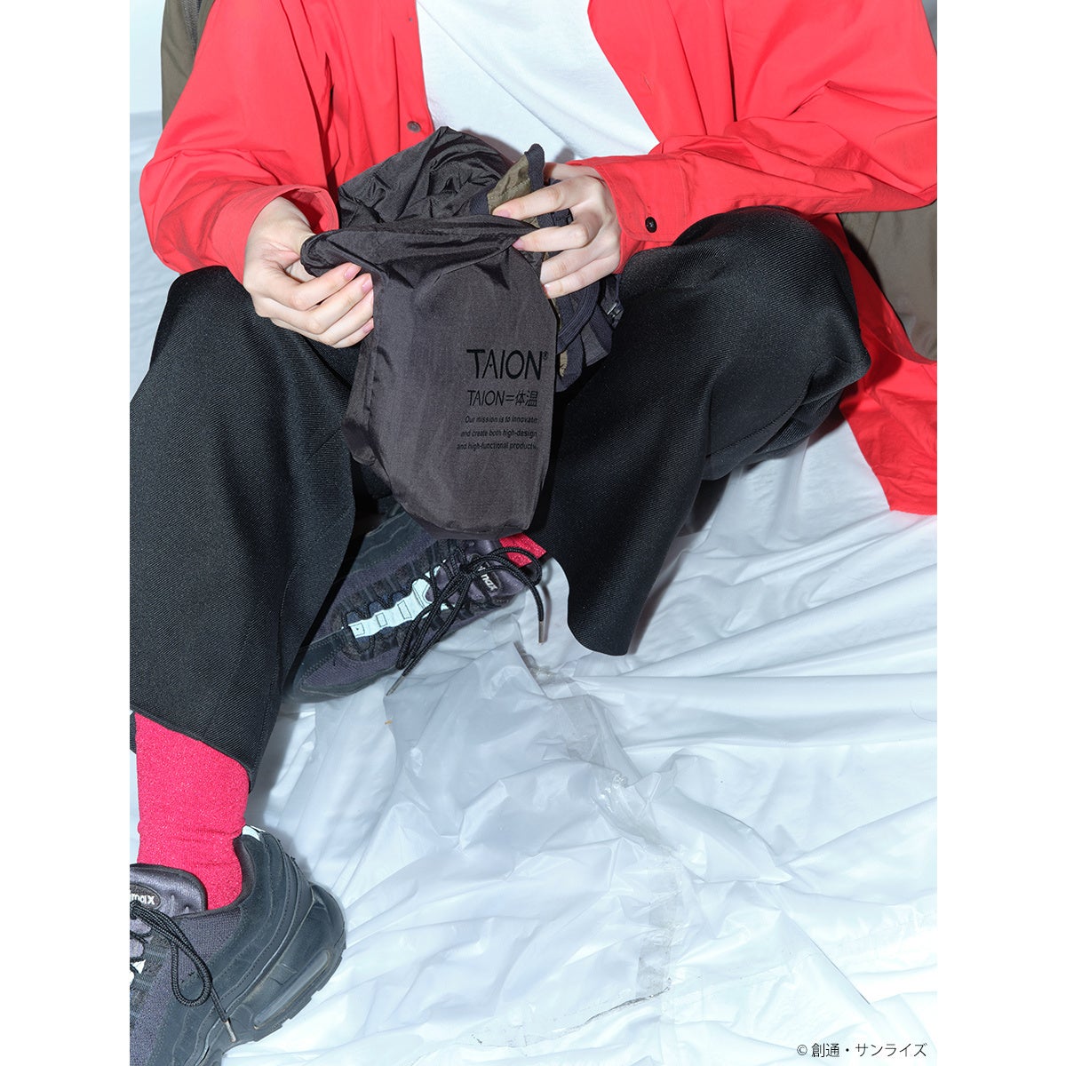 2016年創業、高品質で高機能なインナーダウンを幅広く展開する日本のインナーダウンウェアブランド「TAION(体温)」と『機動戦士ガンダム』とのコラボレーション。インナーダウンが脱着できるシステムを施し、コート単体、ダウンジャケット、ダウン付きコートと季節に合わせて着用できる3WAYアイテムです。