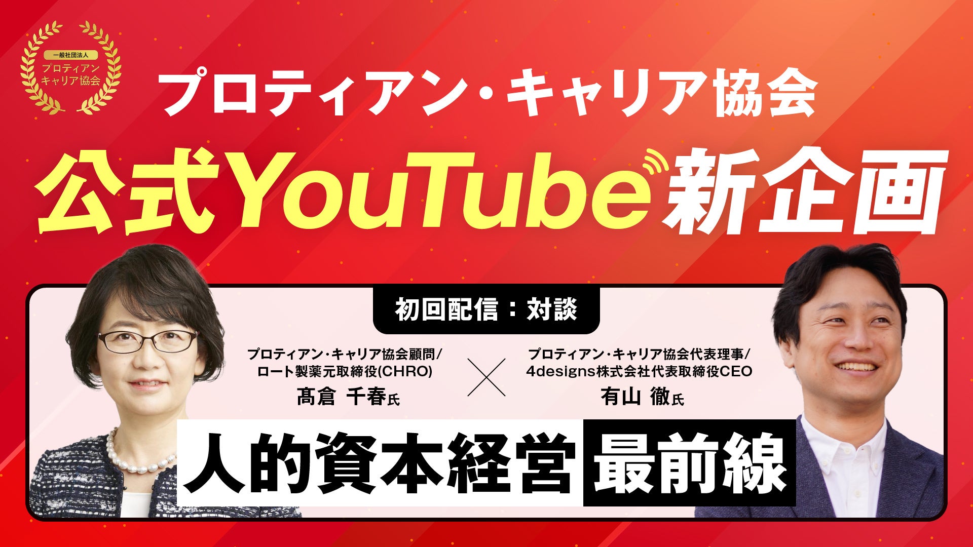 一般社団法人プロティアン・キャリア協会(東京都新宿区、代表理事:田中研之輔・有山徹、以下「当協会」)は、組織と個人のより良い関係構築と個人の主体的なキャリア開発を支援する団体です。このたび、プロティアン・キャリア協会公式YouTubeチャンネルにて新企画「人的資本経営最前線」を開始しました。「人的資本経営」「組織変革」「キャリア戦略」「個人のキャリア形成」など、組織と個人の両方の視点から、多様なコンテンツを配信してまいります。 初回は、当協会 顧問/ロート製薬元取締役(CHRO)髙倉 千春氏と当協会の代表理事 有山徹による「人的資本経営」をテーマとした対談をお届けします。ぜひご覧ください。