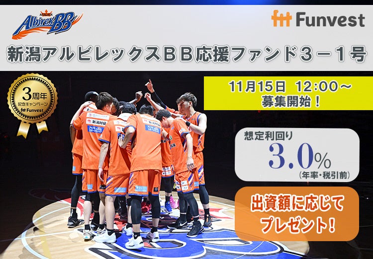 「未来をわかちあう投資」を提供する「Funvest(ファンベスト)」(以下、Funvest)は、「新潟アルビレックスBB応援ファンド3-1号」(以下、本ファンド)の募集を11/15より開始しますので、お知らせいたします。
