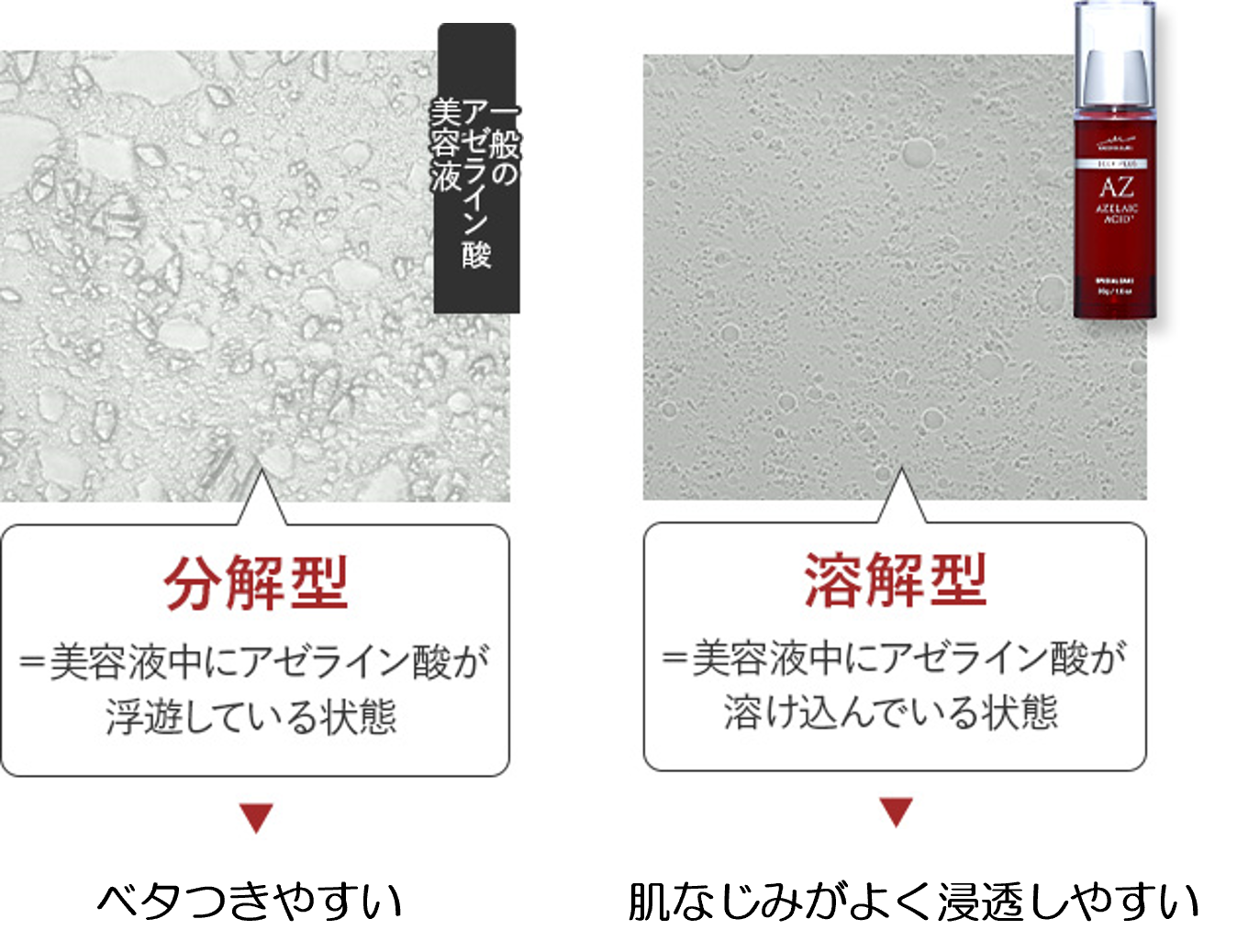 ディーププラスAZは、美容液中に純アゼライン酸を溶解する処方を採用し、低刺激で浸透しやすい乳液状のテクスチャーを実現させました。
