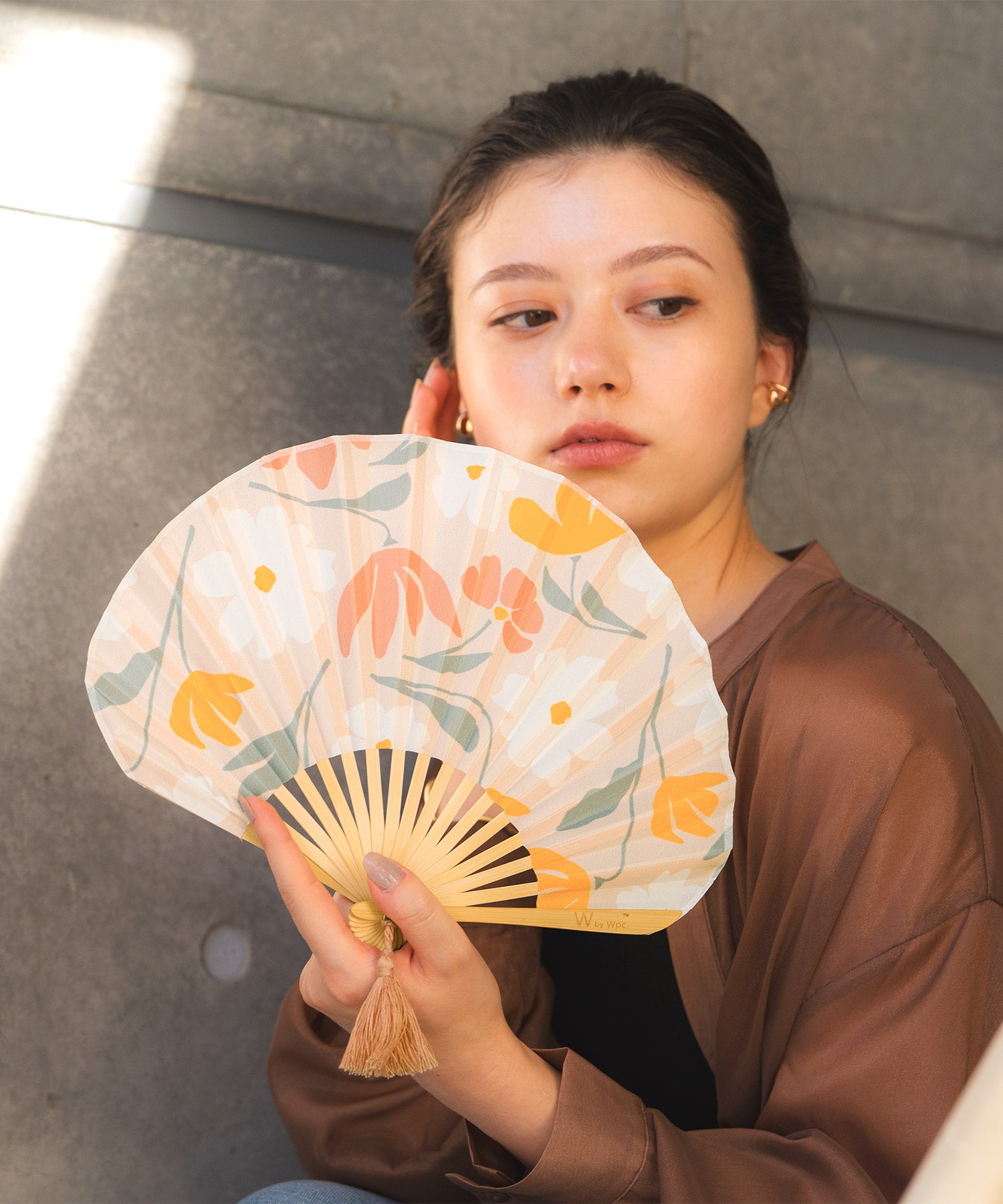 【素材】骨 :竹/表生地:ポリエステル97% ポリウレタン3%/タッセル:ポリエステル 100%/扇子袋裏地:ポリエステル80% 綿20% 【サイズ】縦22.5×横29cm(広げた状態) |
