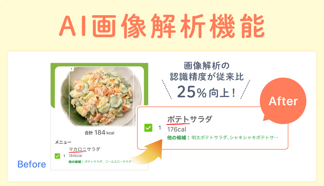 食事の写真を撮るだけでメニューを判定できる「AI画像解析機能」について、生成AIを最適化したことにより、解析精度が従来比25%向上しました。さらに、市販食品の場合、食事写真から文字やロゴ情報を認識し、店名や商品名まで解析できるメニュー件数が増加しました。