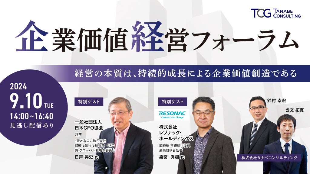 日本の経営コンサルティングのパイオニアである株式会社タナベコンサルティング(本社:東京都千代田区・大阪市淀川区、代表取締役社長:若松 孝彦)は、2024年9月10日(火)14:00~16:40に、無料ウェビナー「企業価値経営フォーラム~経営の本質は、持続的成長による企業価値創造である~」を開催いたします。URL: https://eu1.hubs.ly/H0bDJF-0