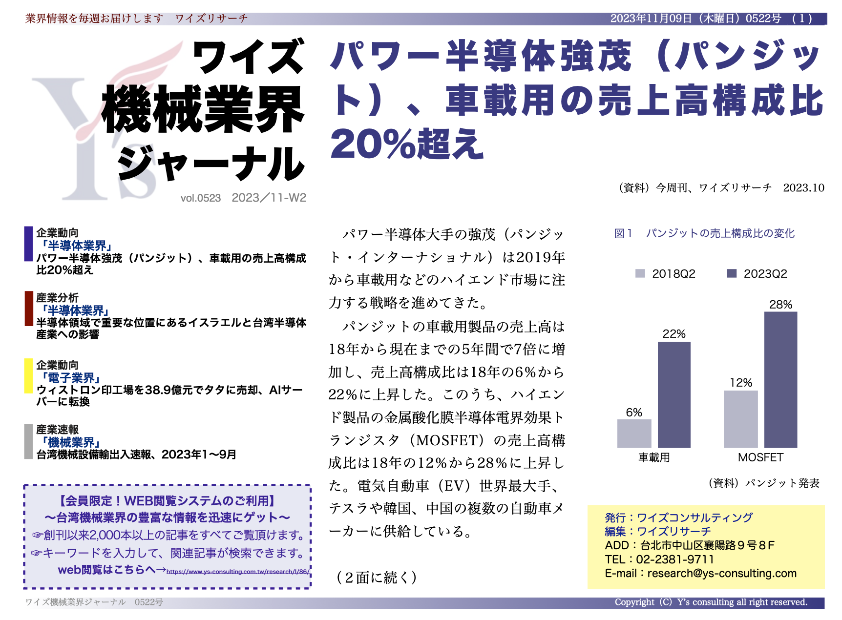 パワー半導体強茂(パンジット)、車載用の売上高構成比20%超え