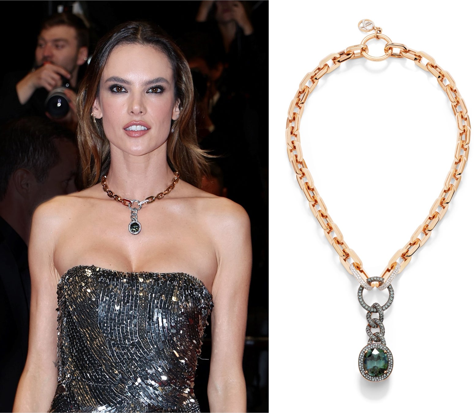 ポメラートの優雅さと洗練されたスタイルを体現する国際的なトップモデルのアレッサンドラ・アンブロジオは、メゾンのミラネーゼスタイルの真髄を凝縮した象徴的なネックレスをまとい第77回カンヌ国際映画祭のレッドカーペットに登場しました。ローズゴールドのチェーンが、グレーサファイヤのパヴェをあしらったグルメチェーンと繋がっています。中央のグレーサファイヤが輝くゴールドサークルを通して絡み合っています。さらに、20.72カラットのグレーグリーントルマリンがペンダントのように下がっています。