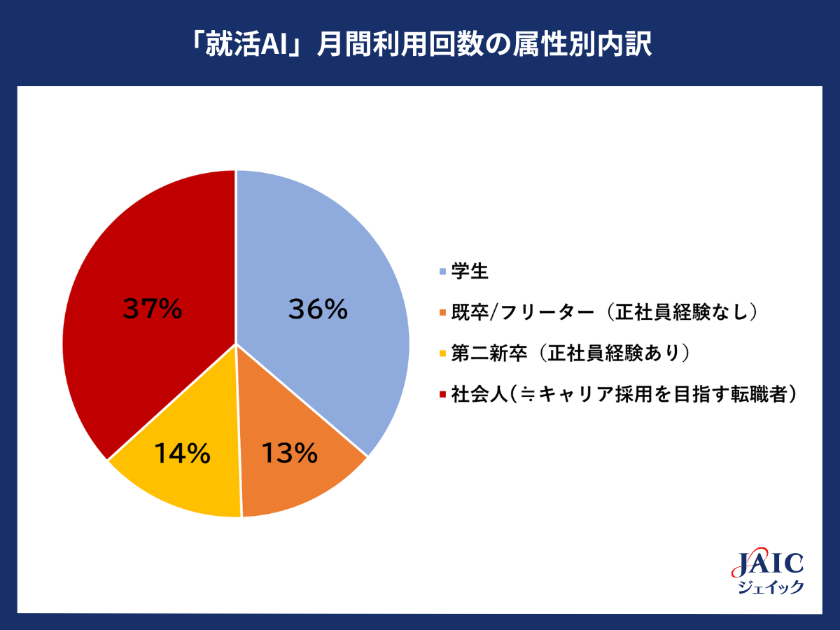 月間利用回数の属性別内訳をみますと、学生36%、第二新卒13%、既卒/フリーター14%、社会人37%という