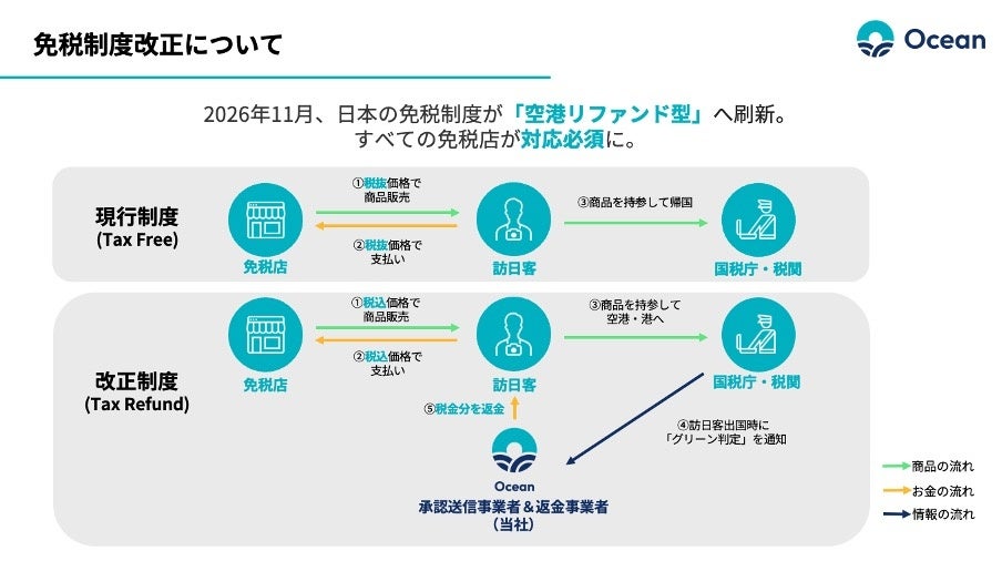 Oceanは、日本国内で2026年11月施行の新免税制度「Tax Refund(※1)」に対応した、デジタル免税・返金一体型サービス「Ocean Tax Refund」を提供しております。