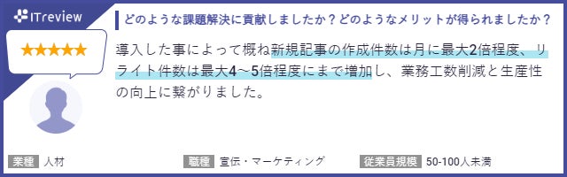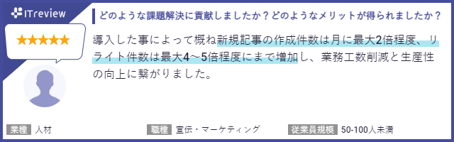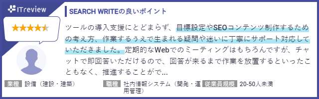 ITreviewにて、SEARCH WRITEを実際に利用いただいているお客様よりたくさんのお声をいただいております。お客様からは「SEOの知識がなくても、何をすべきか分かりやすい」「導入サポートが手厚い」「工数が大幅に削減できた」などのコメントをいただきました。