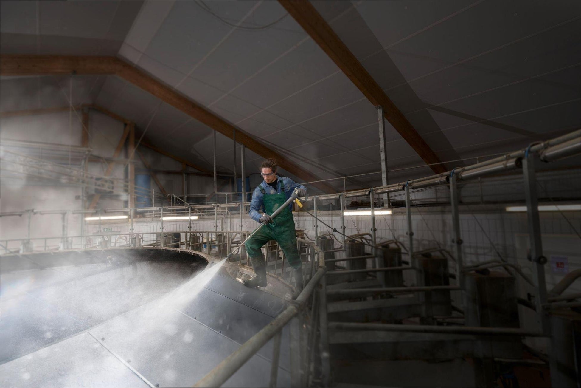 最大の特長は、「高い燃焼効率によるコスト削減」です。 ケルヒャー独自の「ヒートコイルボイラー」構造に加え、本製品ではブロアなどの内部構造も改良し、燃費を最大24%※ 改善しました。さらに、一般的な油汚れに最適な60℃に保つ「エコモード」を組み合わせることで無駄な燃料消費を抑え、ランニングコストを大幅に削減します。