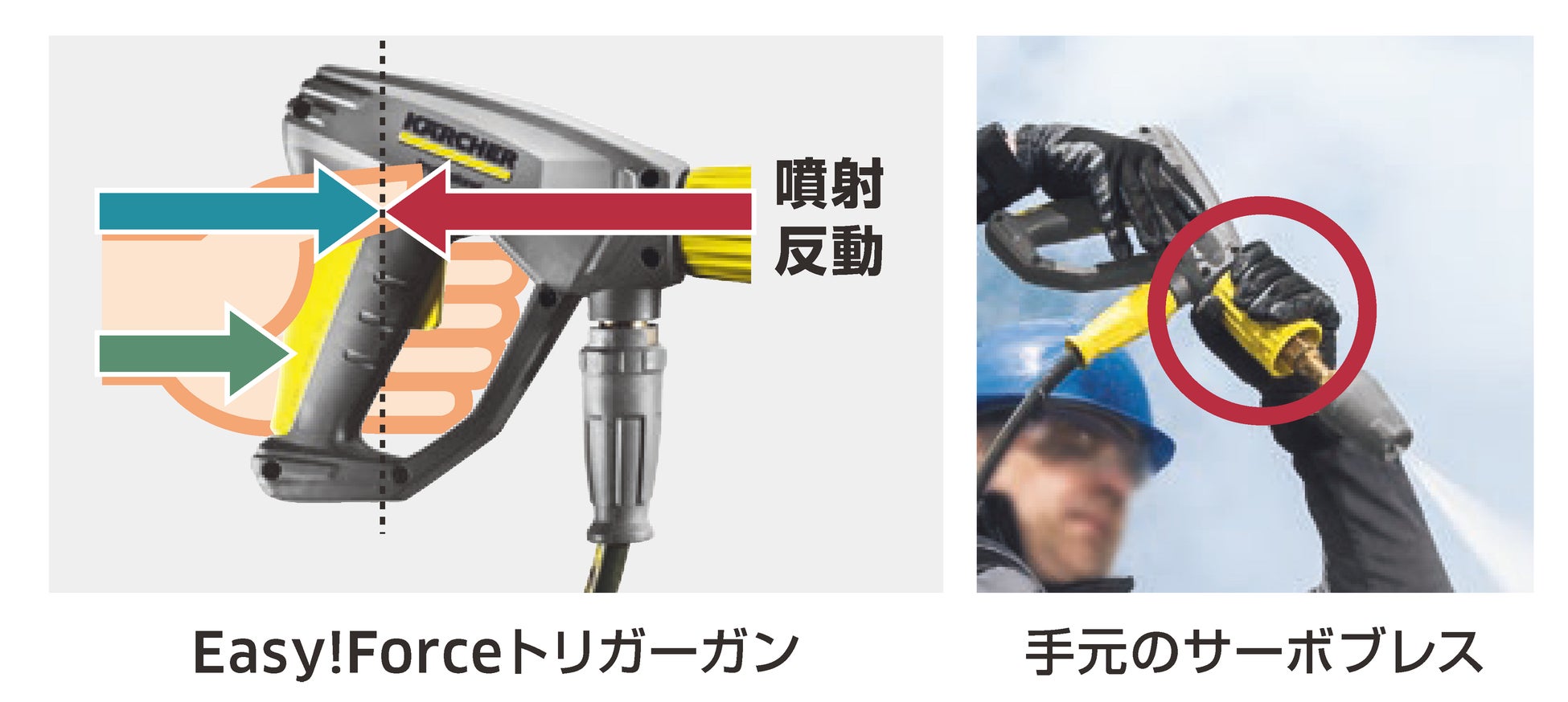 高圧噴射時の反動でトリガーが押され、吐出する技術です。長時間握る必要がないので、手や腕が疲れません。