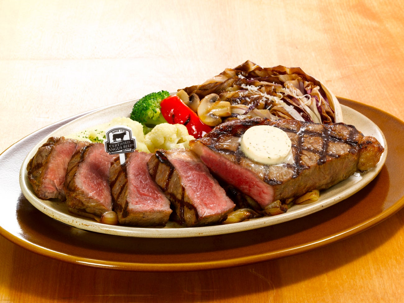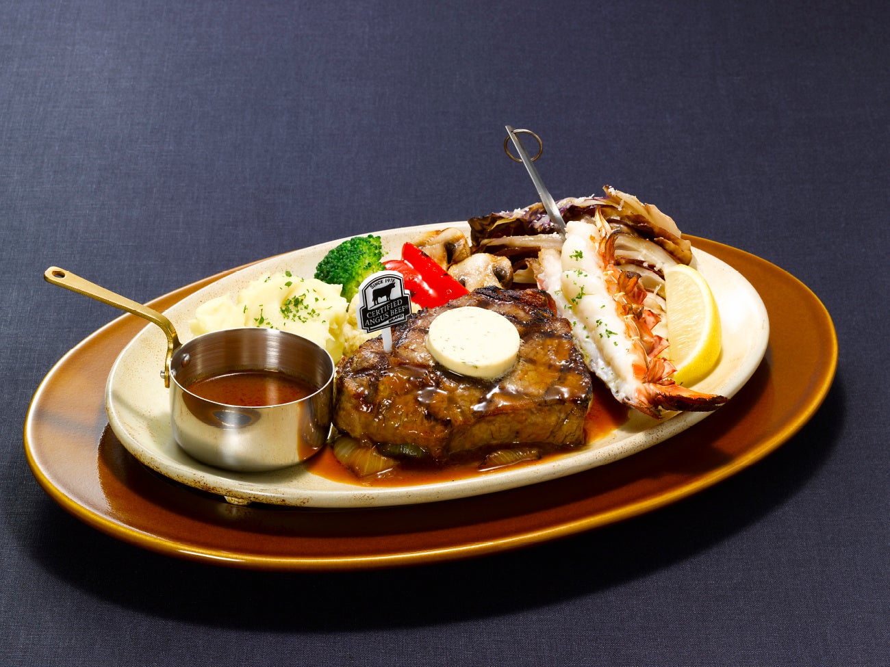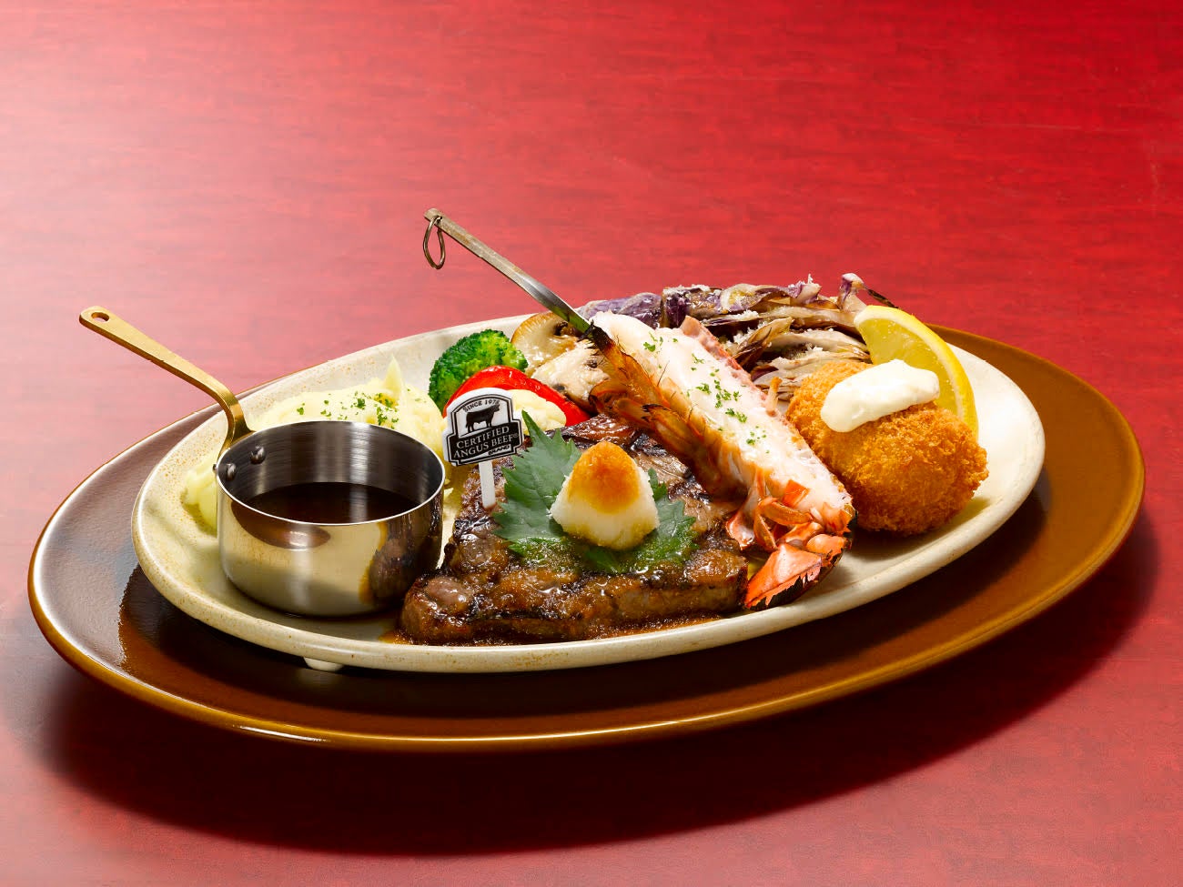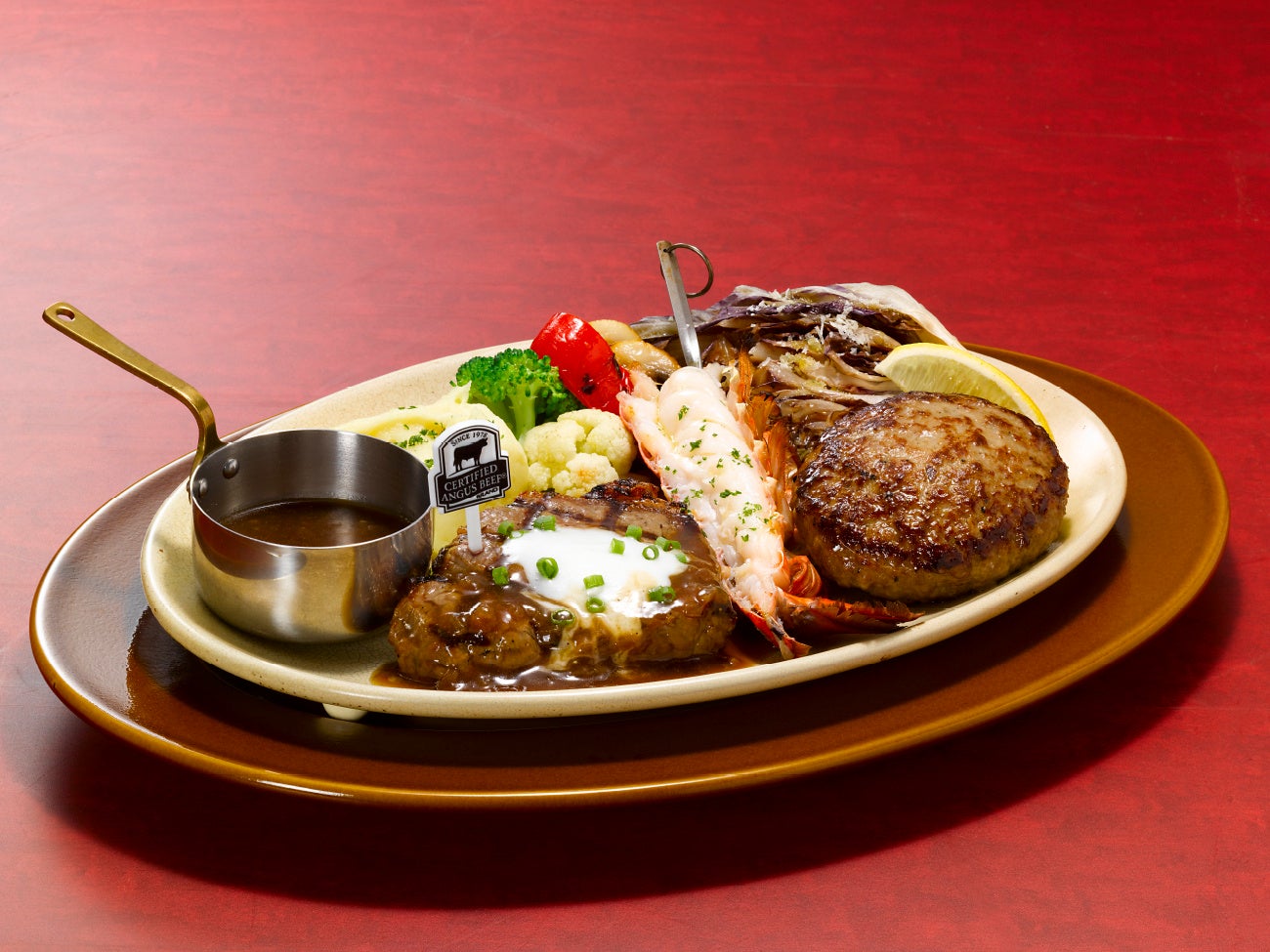 こだわりのCAB®アンガスサーロインの厚切りステーキや、オマール海老との組み合わせメニューを継続してご提供。付け合わせには、マッシュポテトと国産トレビスなど季節を感じられる数種類のグリル野菜を添えています。