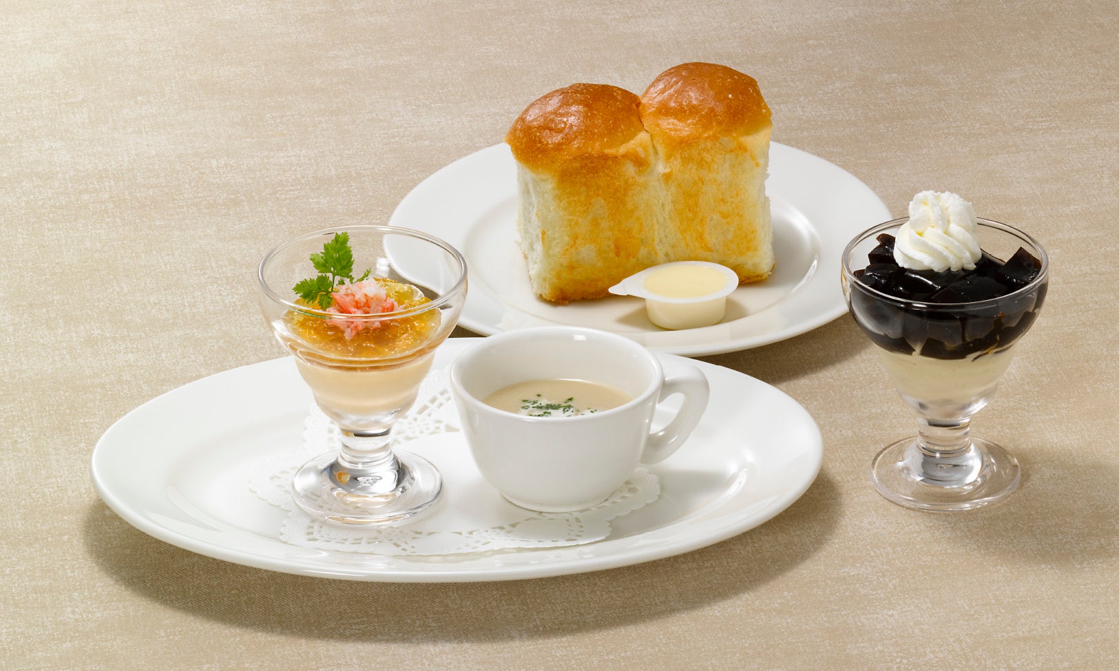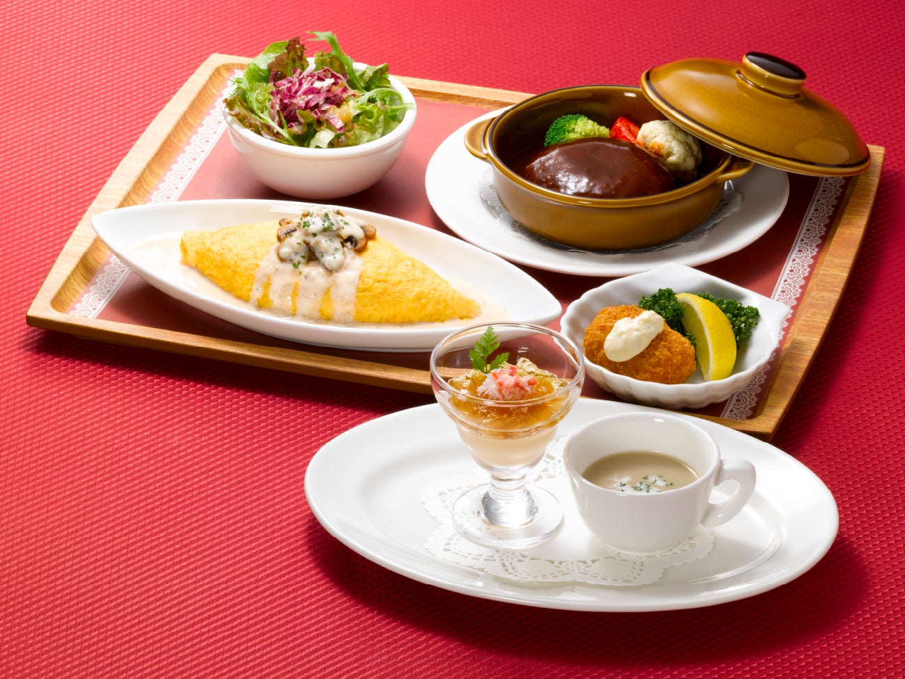 オムライスは、ふんわりとした卵で巻き上げたトマト味のチキンライスに、トリュフ風味のクリームソースをかけ、バターソテーしたマッシュルームをトッピングし、一層香り豊かに仕上げています。肉料理には、ロイヤル自慢のドミグラスソースで煮込んだハンバーグに彩り野菜を添えました。マッシュルームスープとコンソメジュレ&フラン仕立て~蟹~の前菜から始まり、メインには定番の紅ずわい蟹のクリームコロッケまで付いた、ごちそう感たっぷりの洋食小皿です。