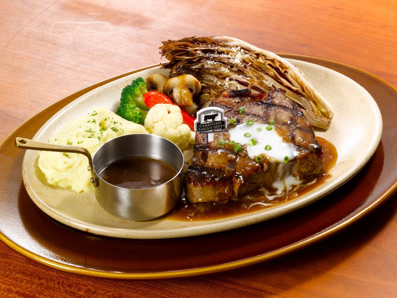 厚切りアンガスサーロインステーキは格子状の焼き目をつけた後、更にオーブンで旨みを閉じ込めるように焼き上げます。CAB®認定アンガスビーフの肉と脂の旨み、厚切りならではの程よい噛み応えとボリューム感をご堪能ください。