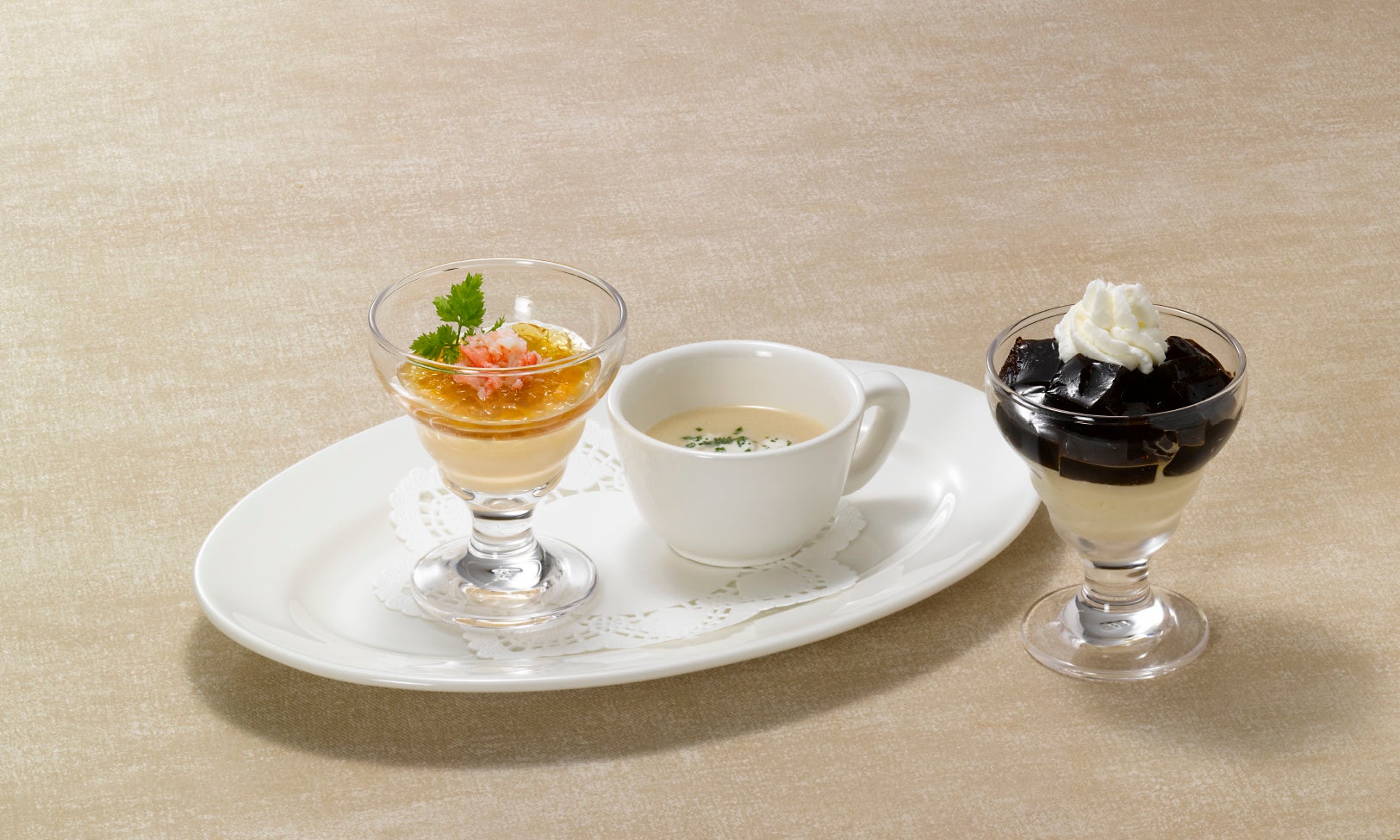 ・ほろにがカフェゼリー・ちいさなスイートポテト・お好きなアイス(バニラブルボン、ベルギーチョコレート、カシスクリーム、塩キャラメル)から1種類