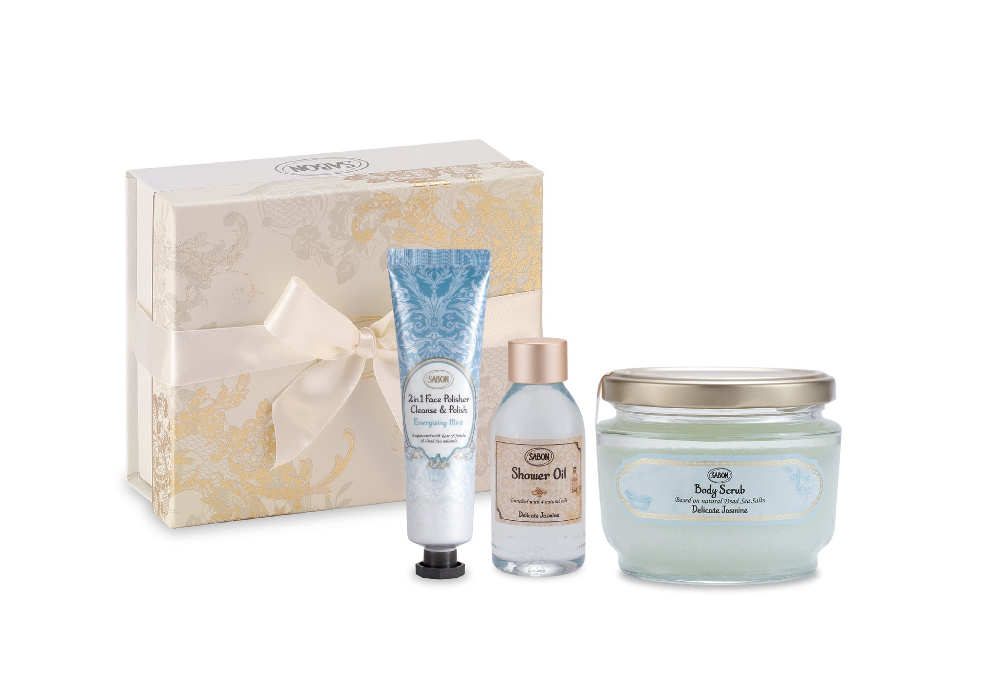 セット内容 フェイスポリッシャー リフレッシング 60mL、シャワーオイル デリケート・ジャスミン 100mL、ボディスクラブ デリケート・ジャスミン 320g、ギフトボックス