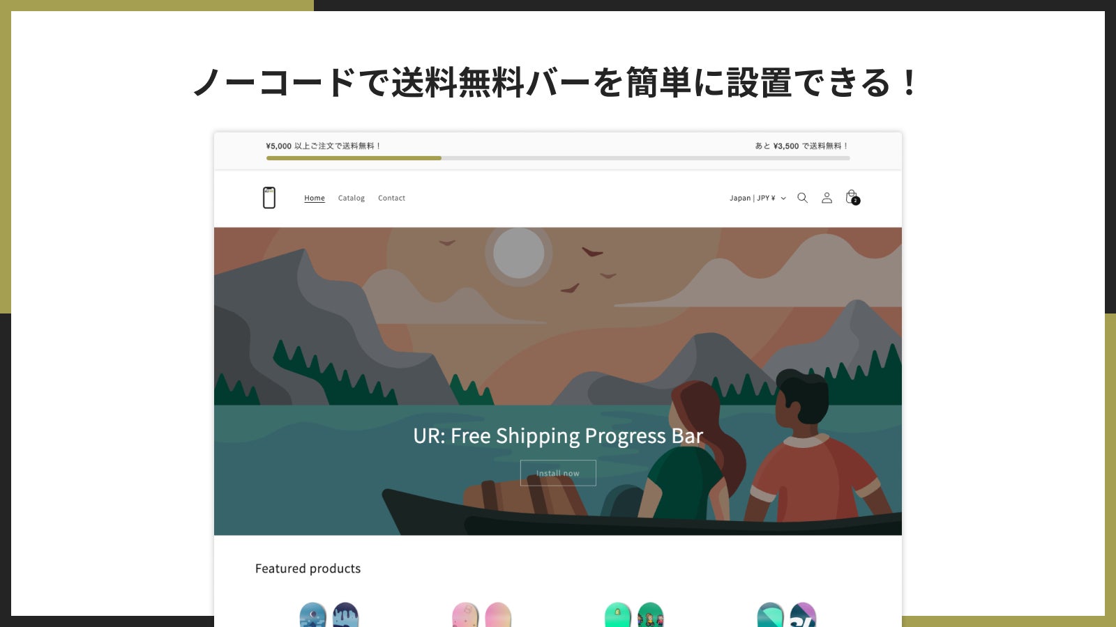 Shopify アプリである「シンプル送料無料バー|あといくらで送料無料表示」は、以下のようにストアに送料無料のプログレスバーを設置できるアプリです。このアプリを活用することで、顧客に送料無料までの金額を明確に伝え、追加購入を促すことができます。