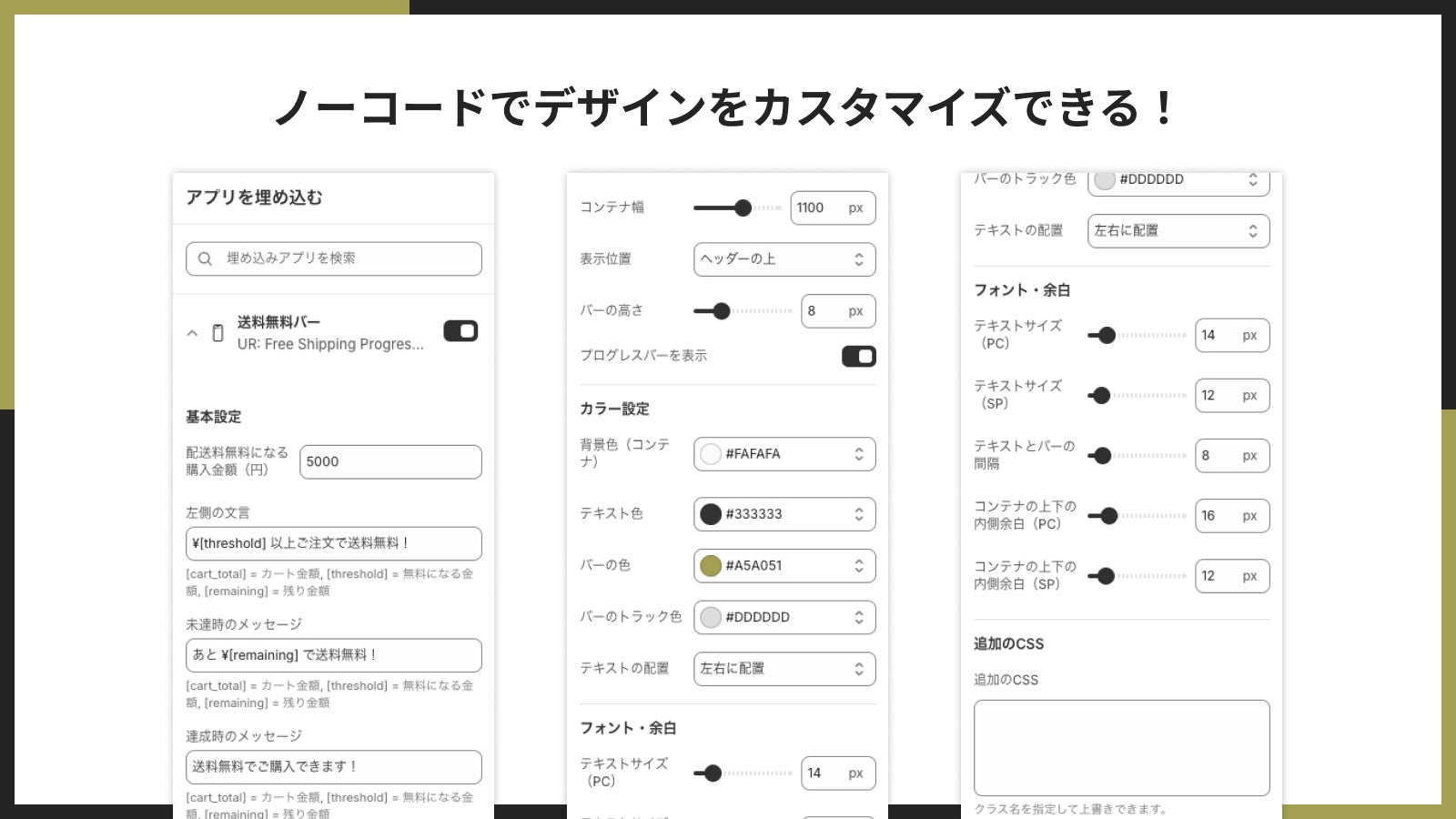 送料無料バーをコード編集なしで簡単に設置できます。専門知識がなくても、誰でもすぐに導入可能です。アプリの管理画面から直感的な操作で設定を行うだけで、プロフェッショナルな送料無料バーがストアに表示されます。技術的なハードルを感じることなく、マーケティング施策を実装できるのが大きな魅力です。