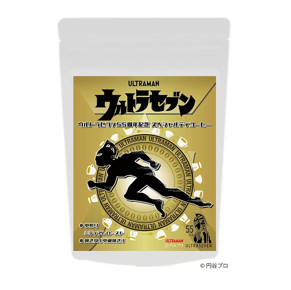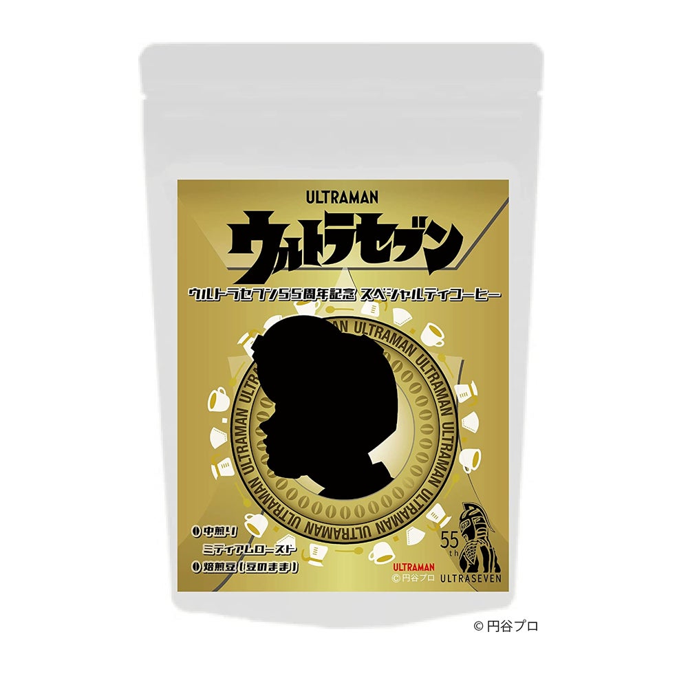 ウルトラセブンとウルトラ警備隊モロボシ・ダン隊員のシルエットが、それぞれデザインされた2種(焙煎豆、挽き豆)のスペシャルティコーヒー。 55周年を記念して、石川県産食用金箔20包(※コーヒー20杯分)が付く、正真正銘のアニバーサリー商品だ。 コーヒーに食用金箔をふりかけることで、いつもと違った一杯が楽しめる。