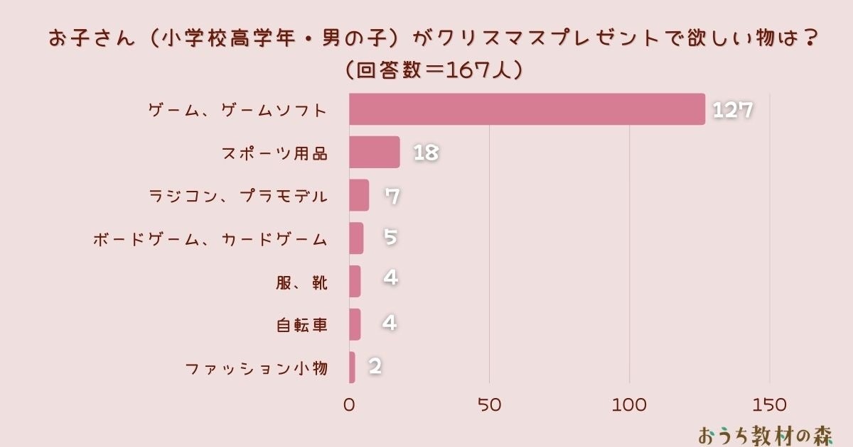 【調査結果】お子さん(小学校高学年・男の子)がクリスマスプレゼントで欲しい物は?1位は『ゲーム、ゲームソフト』!