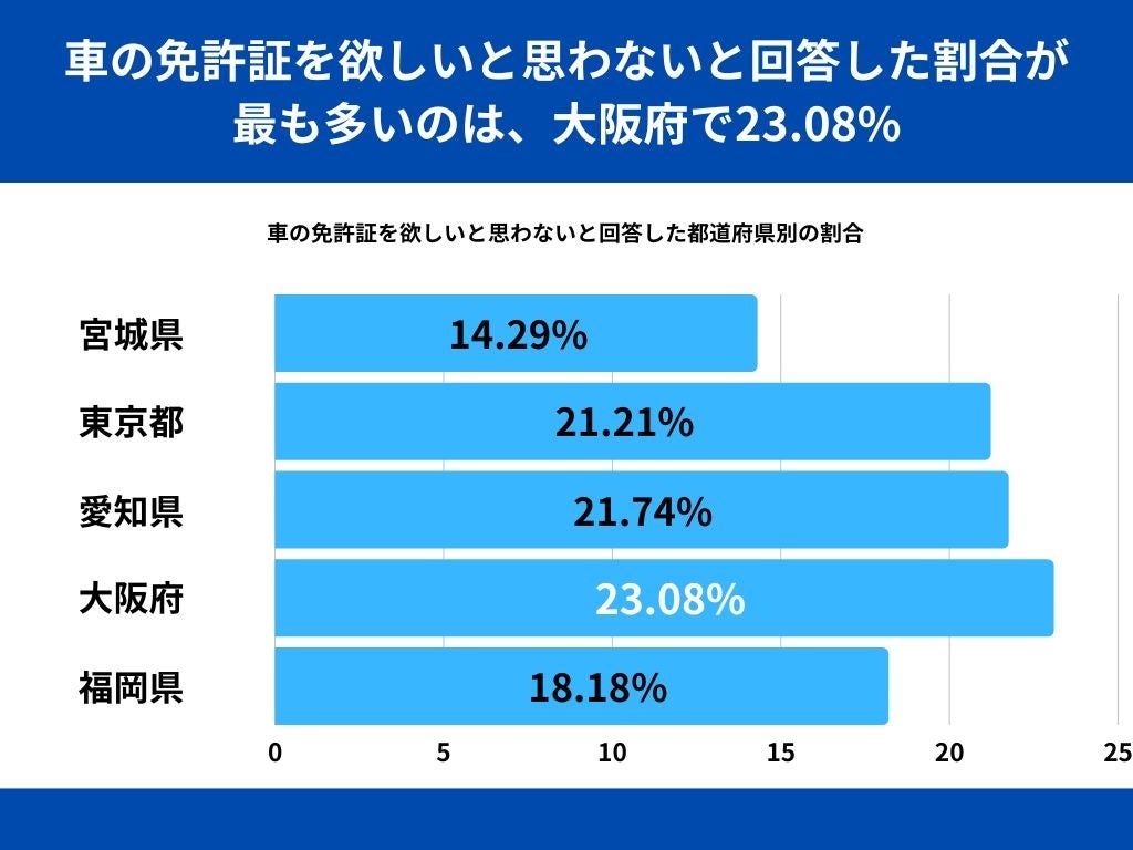 車の免許証を欲しいと思わないと回答した割合を都道府県別でみてみますと、大阪府が最も多く23.08%、次いで愛知県の21.74%、宮城県は14.29%という結果になりました。