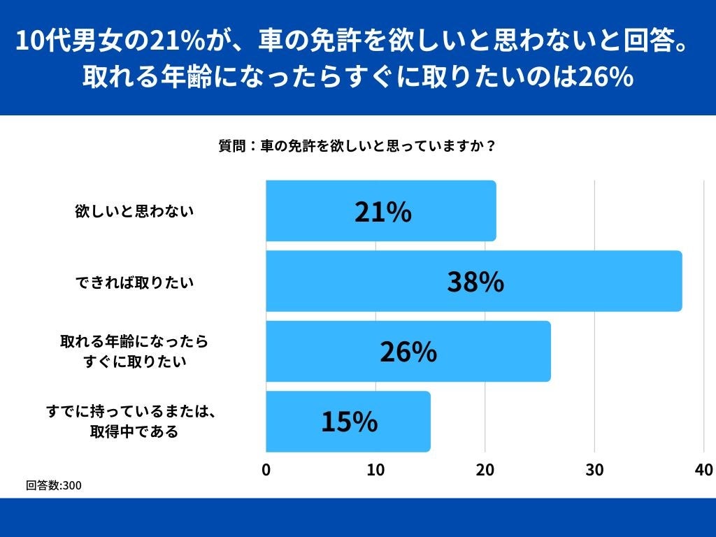 10代男女の21%が、車の免許を欲しいと思わないと回答。取れる年齢になったらすぐに取りたいのは26%【車の免許に関するアンケート】