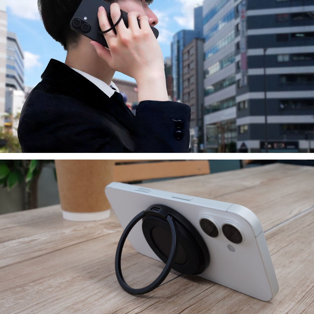 本体にはスマホリングが備わっており、落下防止に役立ちます。また、スタンドとしても使えるため動画視聴やWeb会議にお使いいただけます。