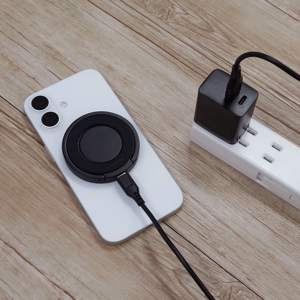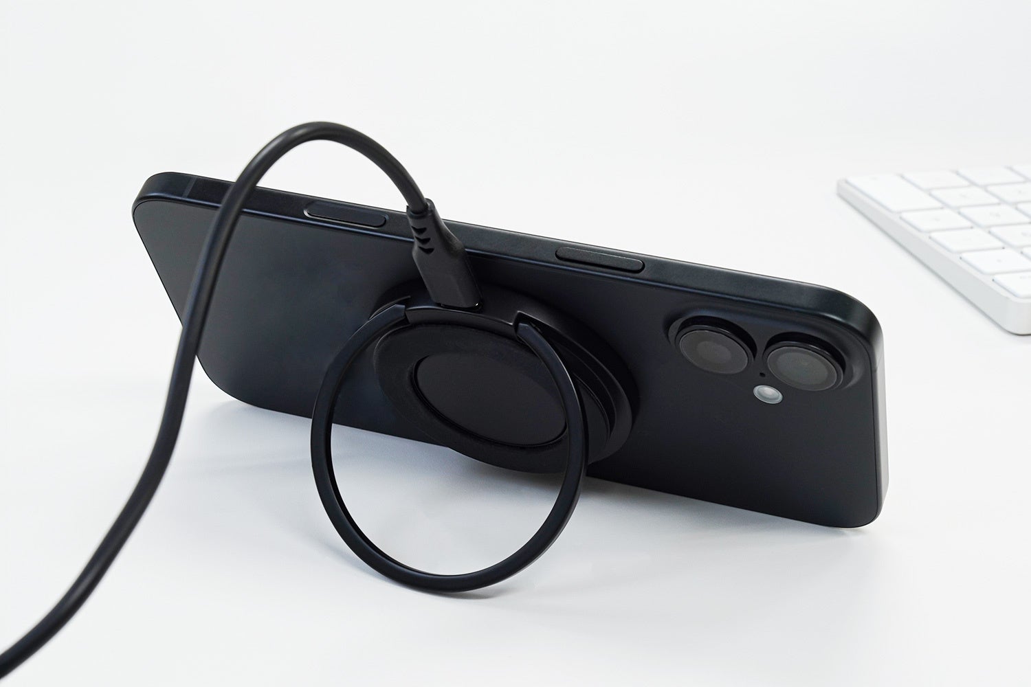 本製品はiPhoneなどの背面に装着して使用するワイヤレス充電器です。MagSafeやQi2対応機器にマグネットで固定でき、確実なワイヤレス充電が可能です。