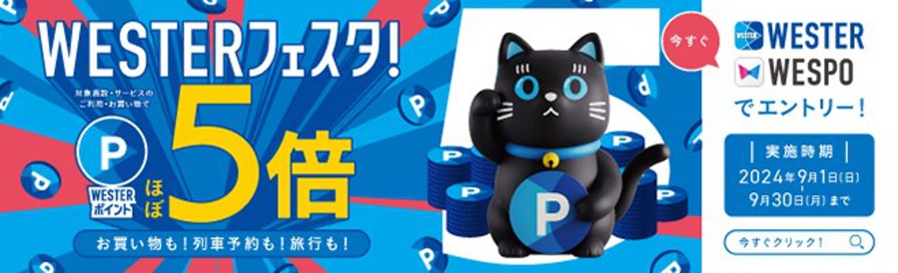 この度開催する「秋のWESTERフェスタ!」キャンペーンは、鉄道予約や、物販・飲食店舗、旅行・ホテル、その他の対象サービスを利用することで、WESTERポイントが“ほぼ”5倍たまります。