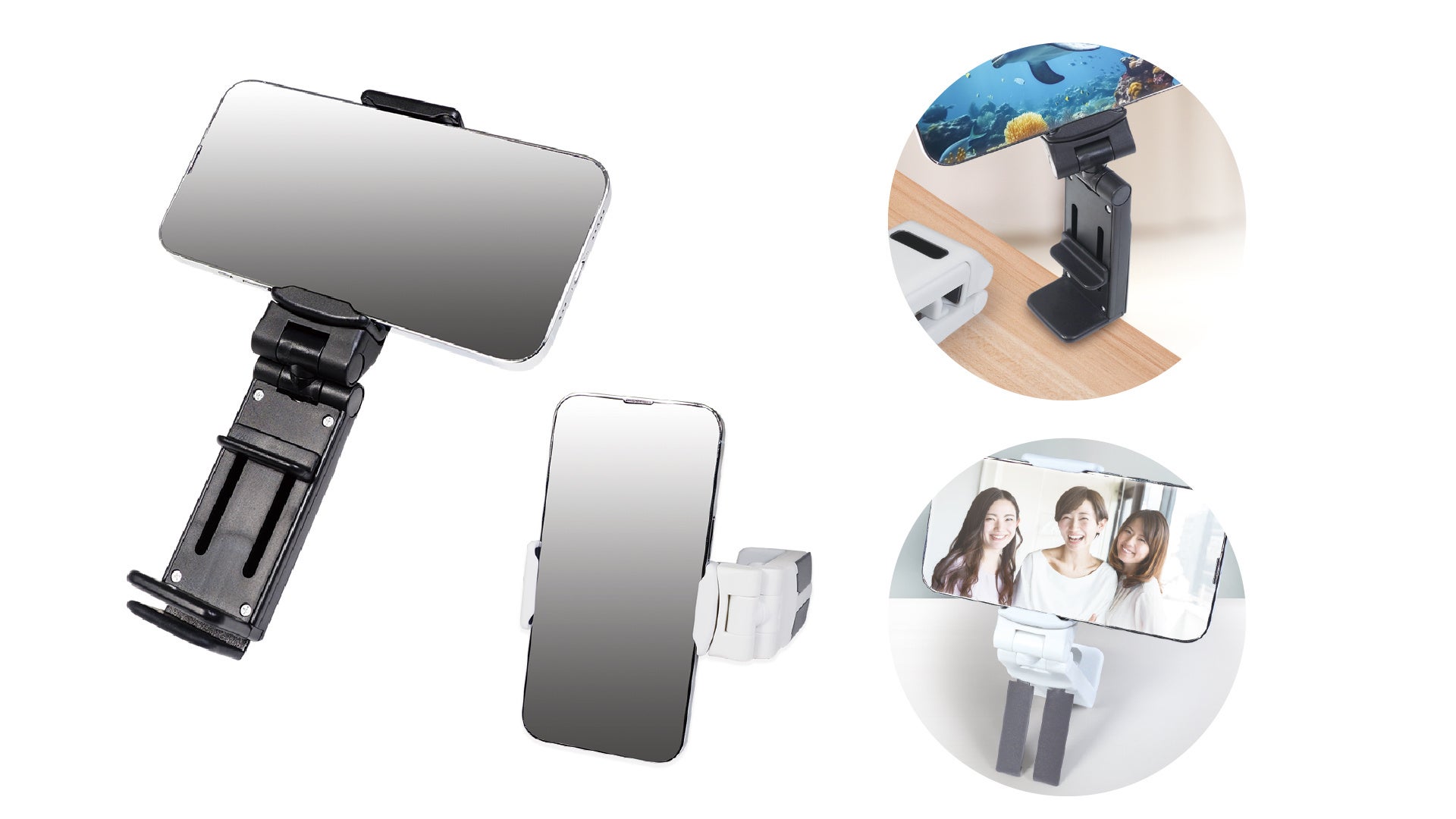 特徴:角度調整自在のスマホスタンド。水平垂直方向の角度調節と縦・横の回転が可能!ビデオ通話や調理の際にテーブルなどに固定して便利に使えます。スタンド部分を伸ばして使えば簡易の手持ちグリップとしても!カラーは「ブラック・ホワイト」の2種類。