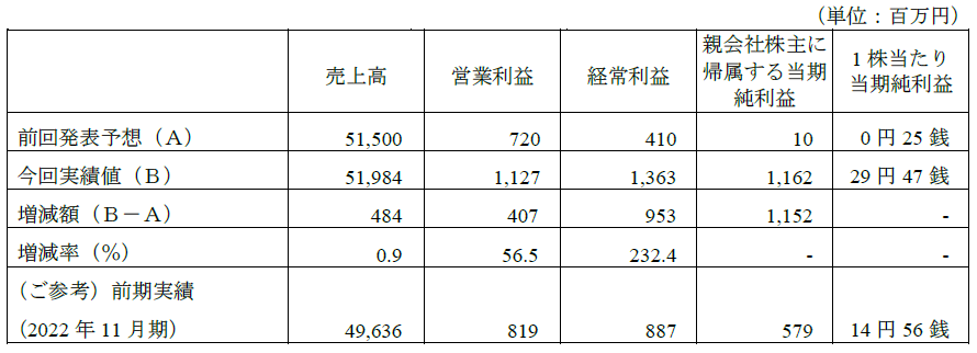 1. 2023年11月期通期連結業績予想数値の修正(2022年12月1日~2023年11月30日)