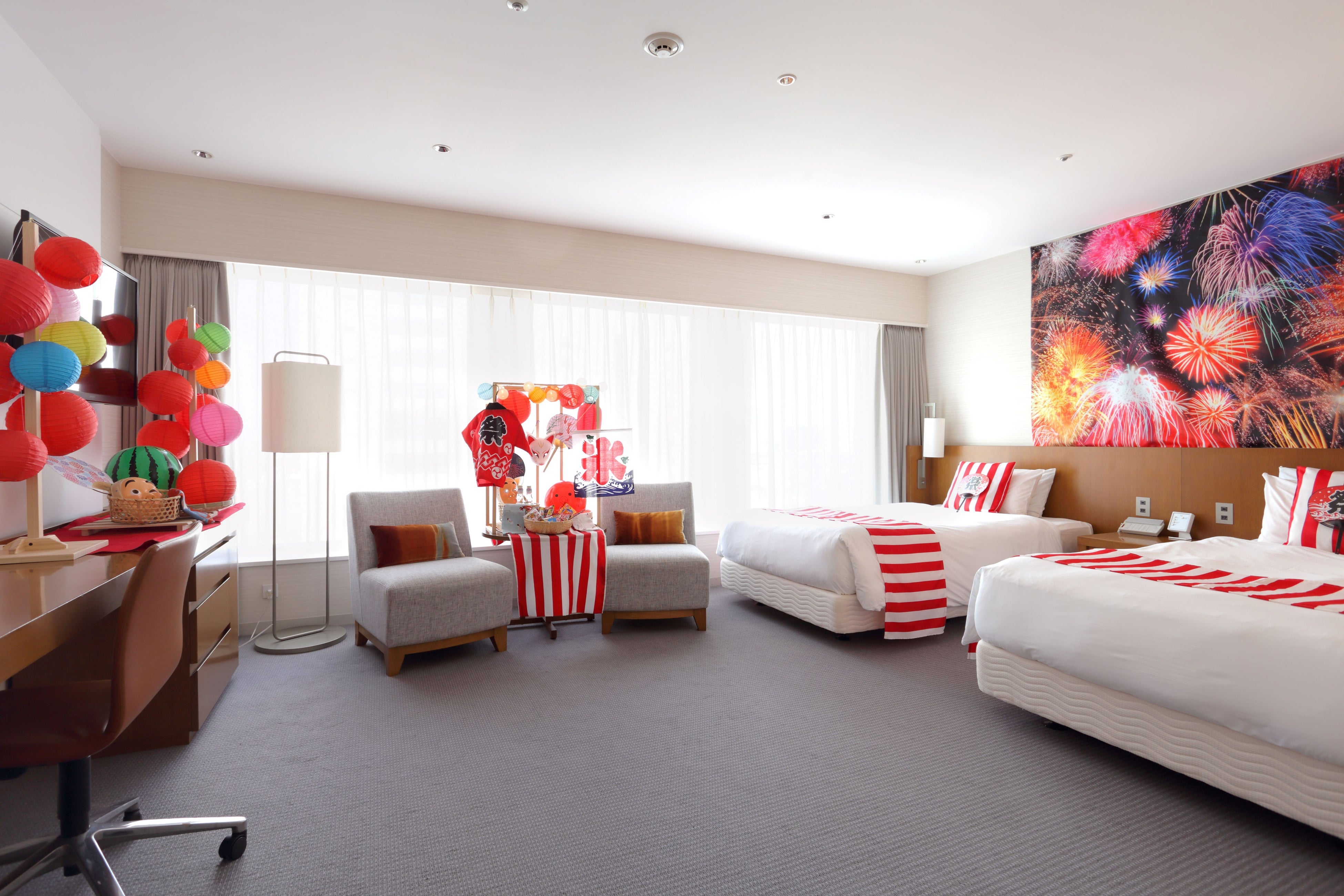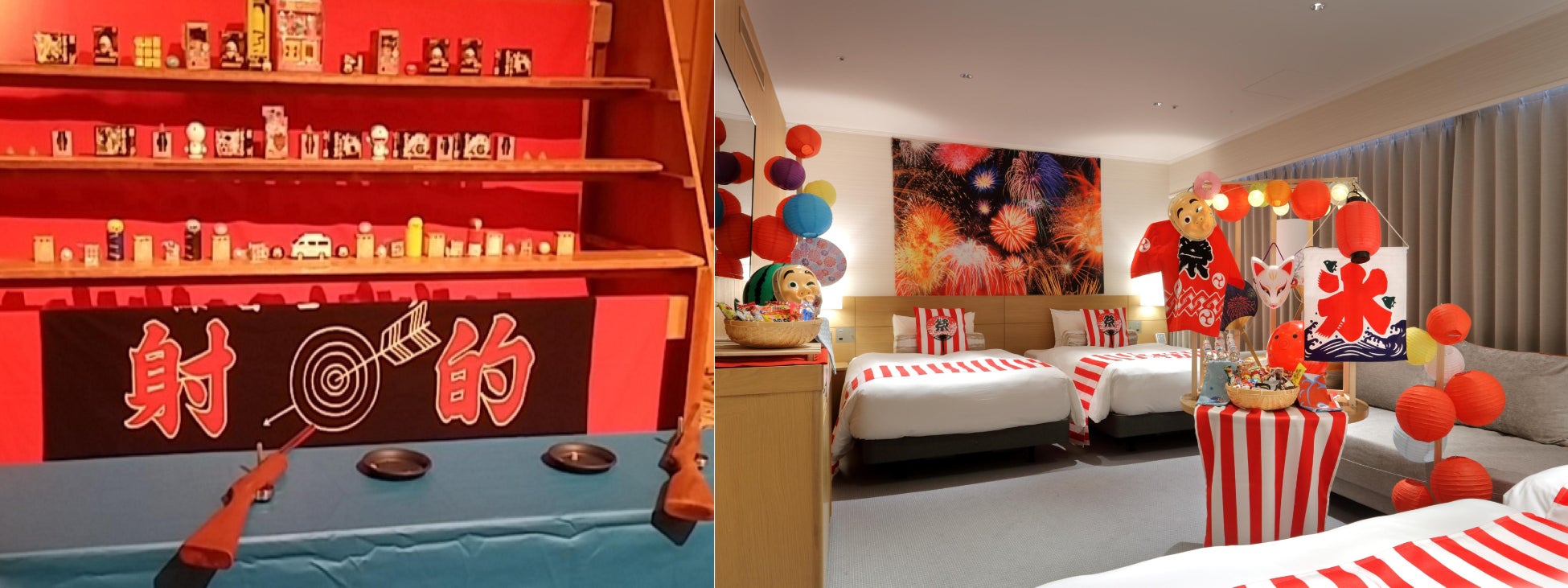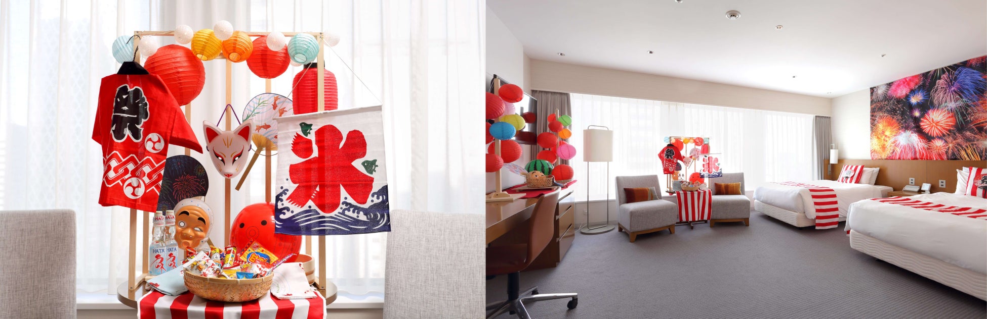 このほか、お部屋の中は「縁日」ならではの、お面や提灯、ラムネや駄菓子などで縁日気分を盛り上げる装飾を施した宿泊プランをご用意しました。小さなお子様から大人まで夏を満喫していただけるプランです。