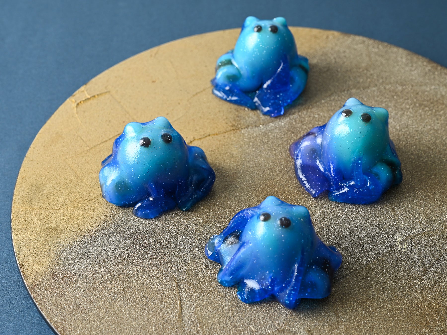 銀河の彩を表現した寒天ゼリーで黒糖味の煉切餡を包み、銀河系を浮遊する宇宙人をイメージしました。大好物の星の欠片を食べすぎて、体に星の煌めきが散っています。青く輝く美しい地球に惹かれて遠いところからやって来ました。特技は周りの景色に擬態すること。もしあなたの横で私を見かけたら、ぜひ声をかけてください。