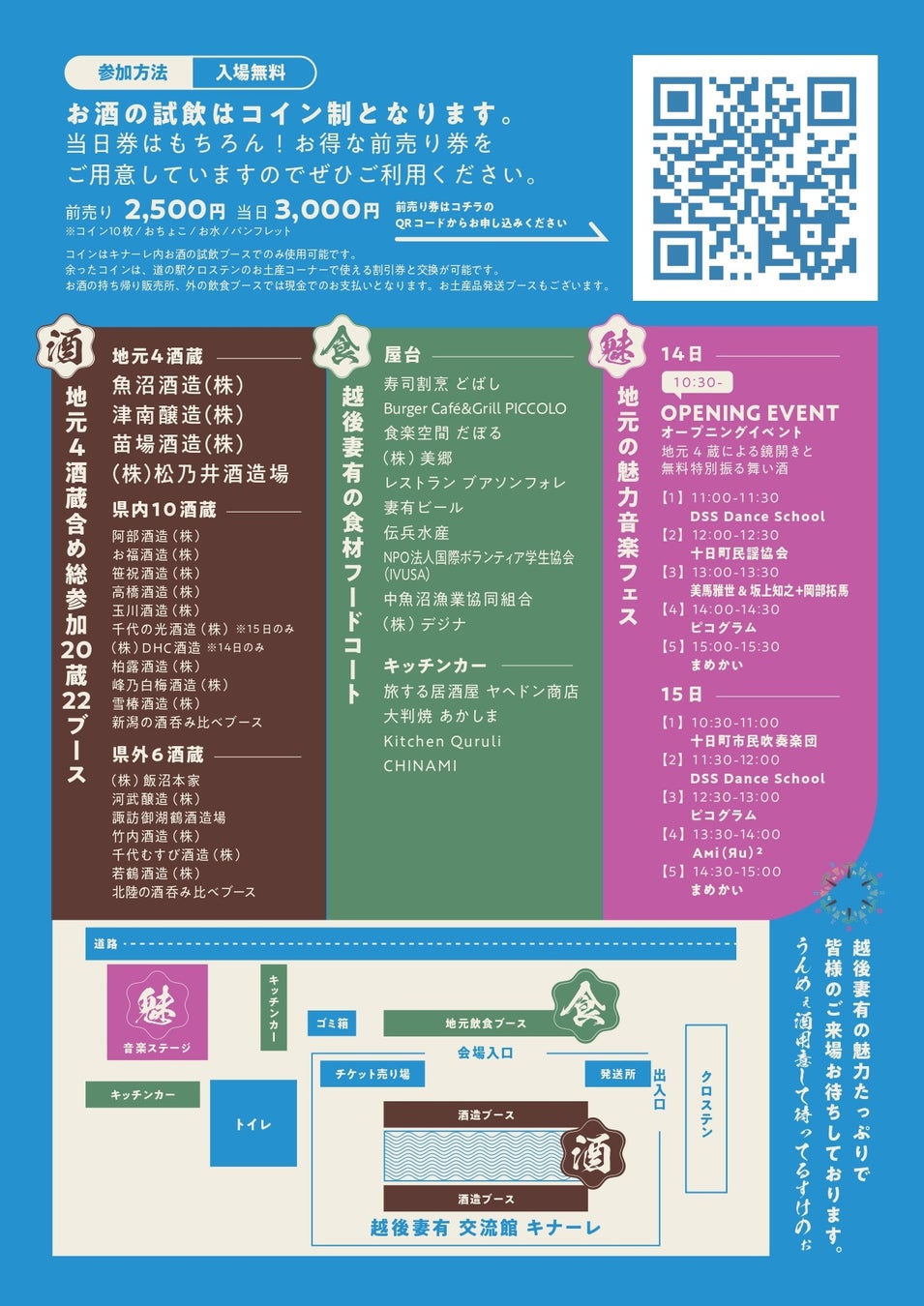 ・十日町、津南地域の4酒蔵と県内10酒蔵、県外6酒蔵から参加いただき、越後妻有地域の地酒と県内外の日本酒を呑み比べできるイベントです。