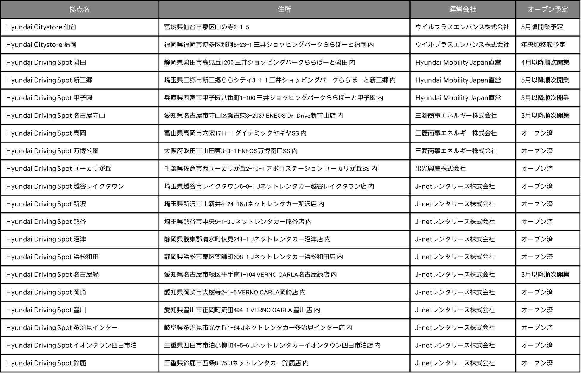 5月に「Hyundai Citystore 仙台」を仙台市泉区のロードサイド型拠点として開業予定です。また、「Hyundai Citystore 福岡」を三井不動産株式会社が展開する三井ショッピングパークららぽーと福岡へ年央に移転し、より快適な試乗体験やブランド発信を図ります。加えて、直営試乗拠点として「Hyundai Driving Spot」を三井ショッピングパークららぽーと新三郷、三井ショッピングパークららぽーと磐田、三井ショッピングパークららぽーと甲子園の3箇所で4月以降順次開業予定です。