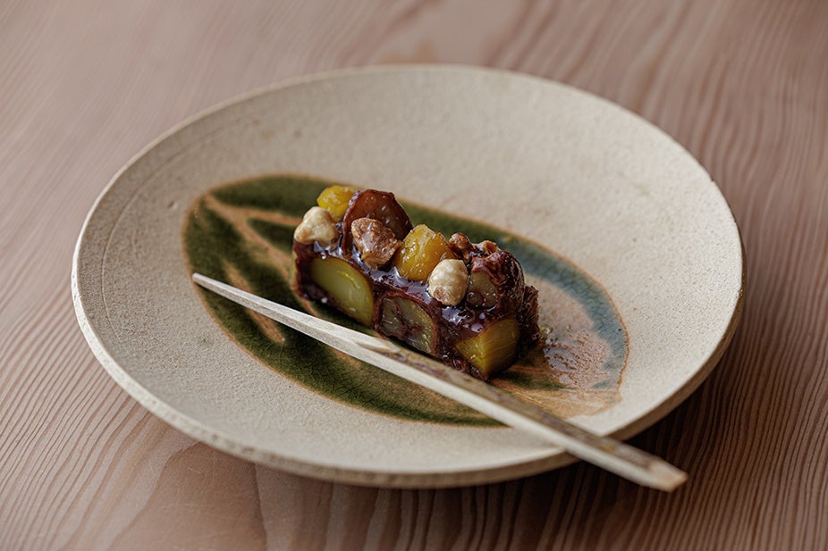 蒸し羊羹の上には、胡桃とヘーゼルナッツの飴煮を添え、ほのかに香るラム酒が、栗とナッツの風味を優しく引き立てます。栗と小豆の定番の組み合わせを、食材本来の味わいにこだわり、一層趣深く、奥行きのある味わいに仕上げました。