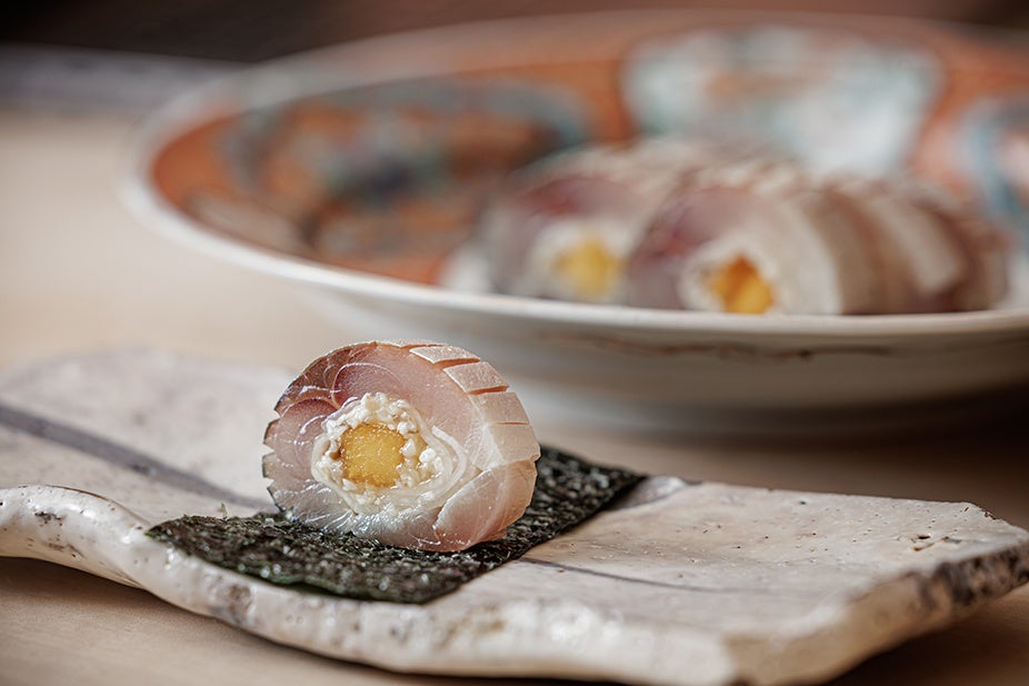 魚には脂ののった秋鯖を使用。鰤で仕立てることが多いかぶらずしを、季節感あふれる秋鯖でアレンジし、さらに柿を忍ばせることで、ほのかな甘みと彩りを添えました。