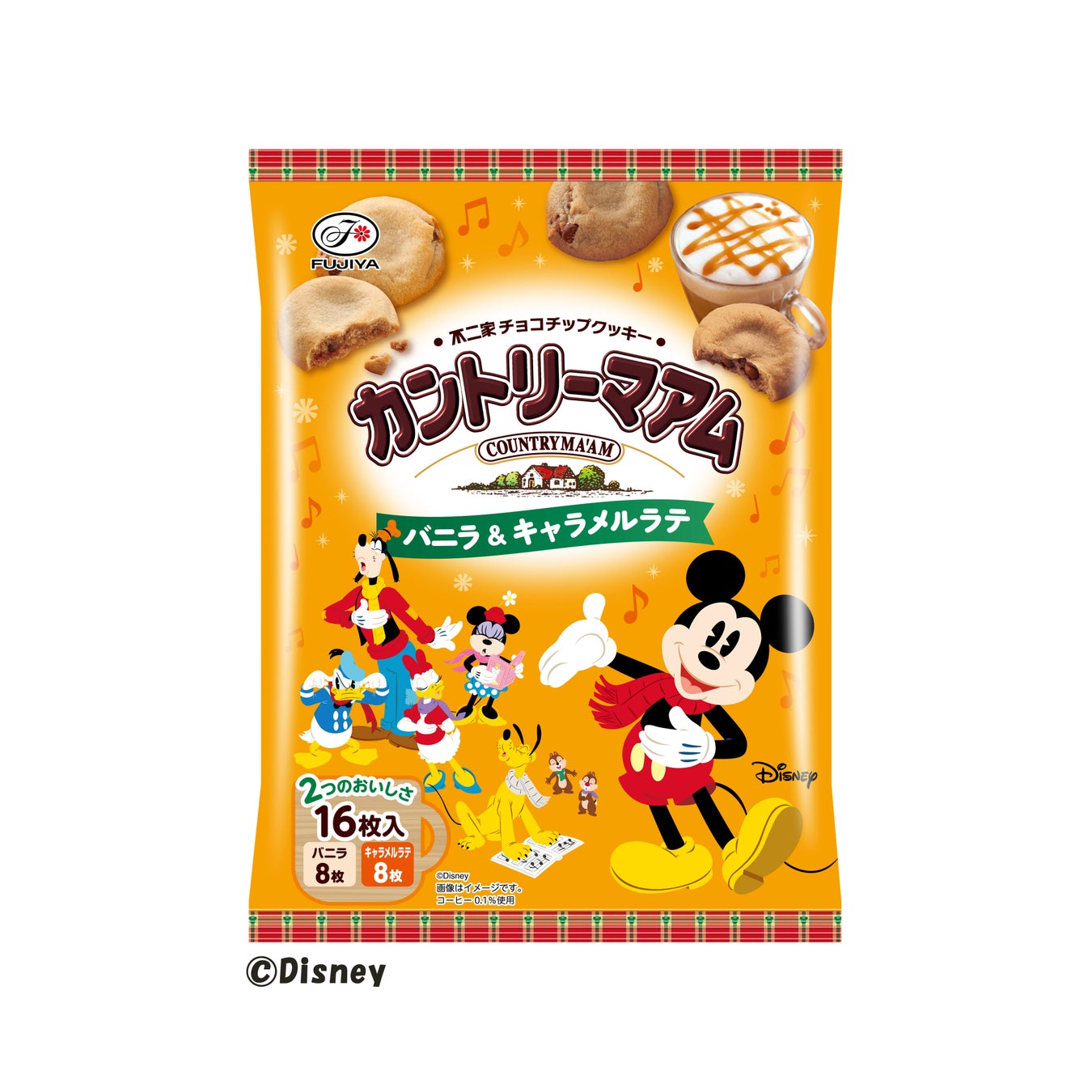 ディズニーのキャラクターたちとともに冬の訪れを感じる期間限定商品が登場! 「カントリーマアム(バニラ&キャラメルラテ)」「ホームパイ(バター&ロイヤルミルクティー)」