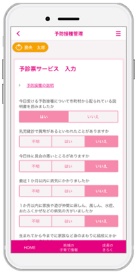 予防接種に係る手間を削減するため、今回「小児予防接種サービス」を導入しました。保護者のみなさんが安心して子育てができるように、この機能をご活用いただければと思います。