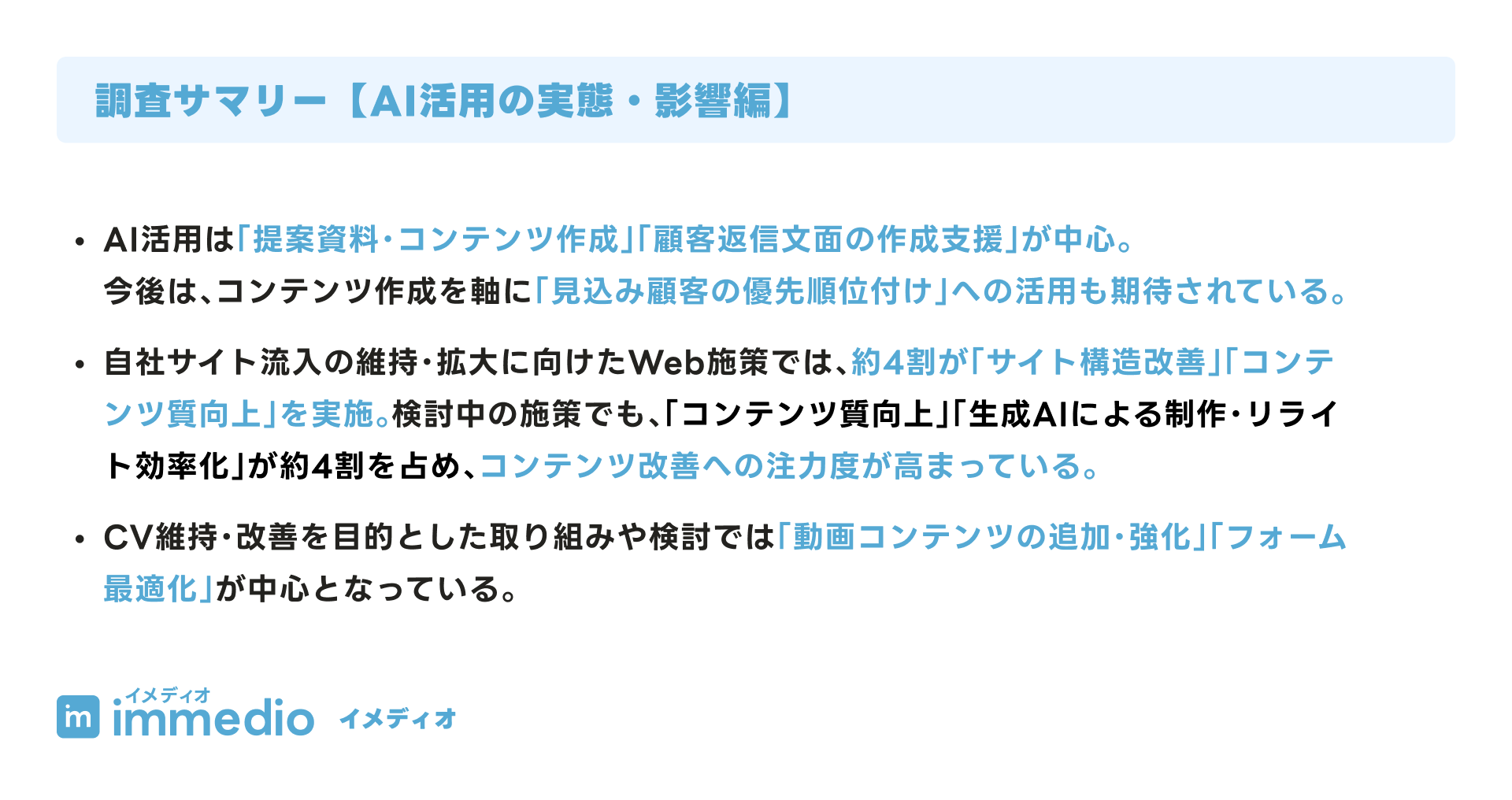 調査レポート|全国のインサイドセールス職に聞いたAI活用実態。主流は「コンテンツ作成支援」、営業活動の支援領域で利用が定着。~自社サイト流入の維持・拡大に向けたWeb施策は「コンテンツの質向上」~