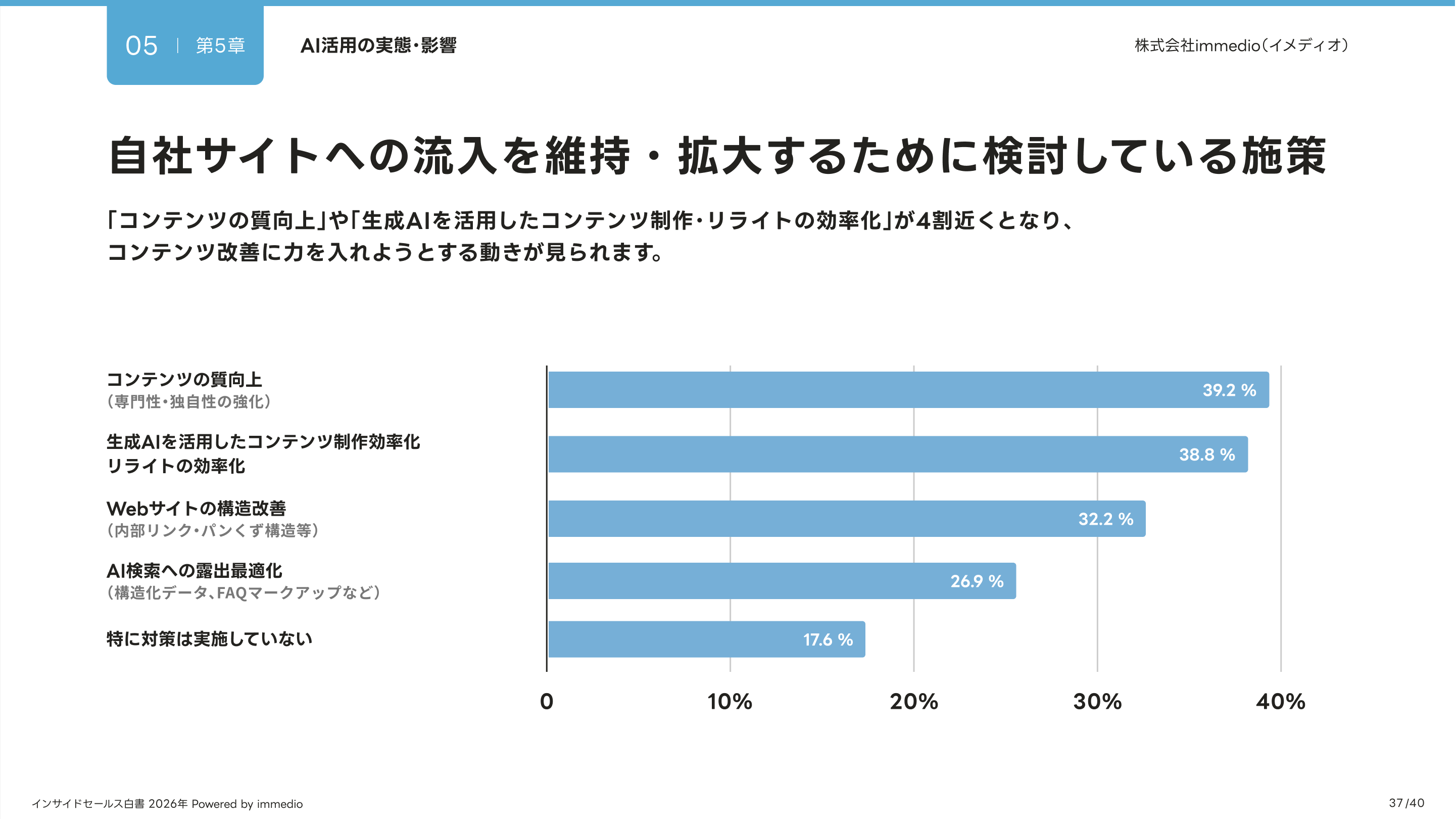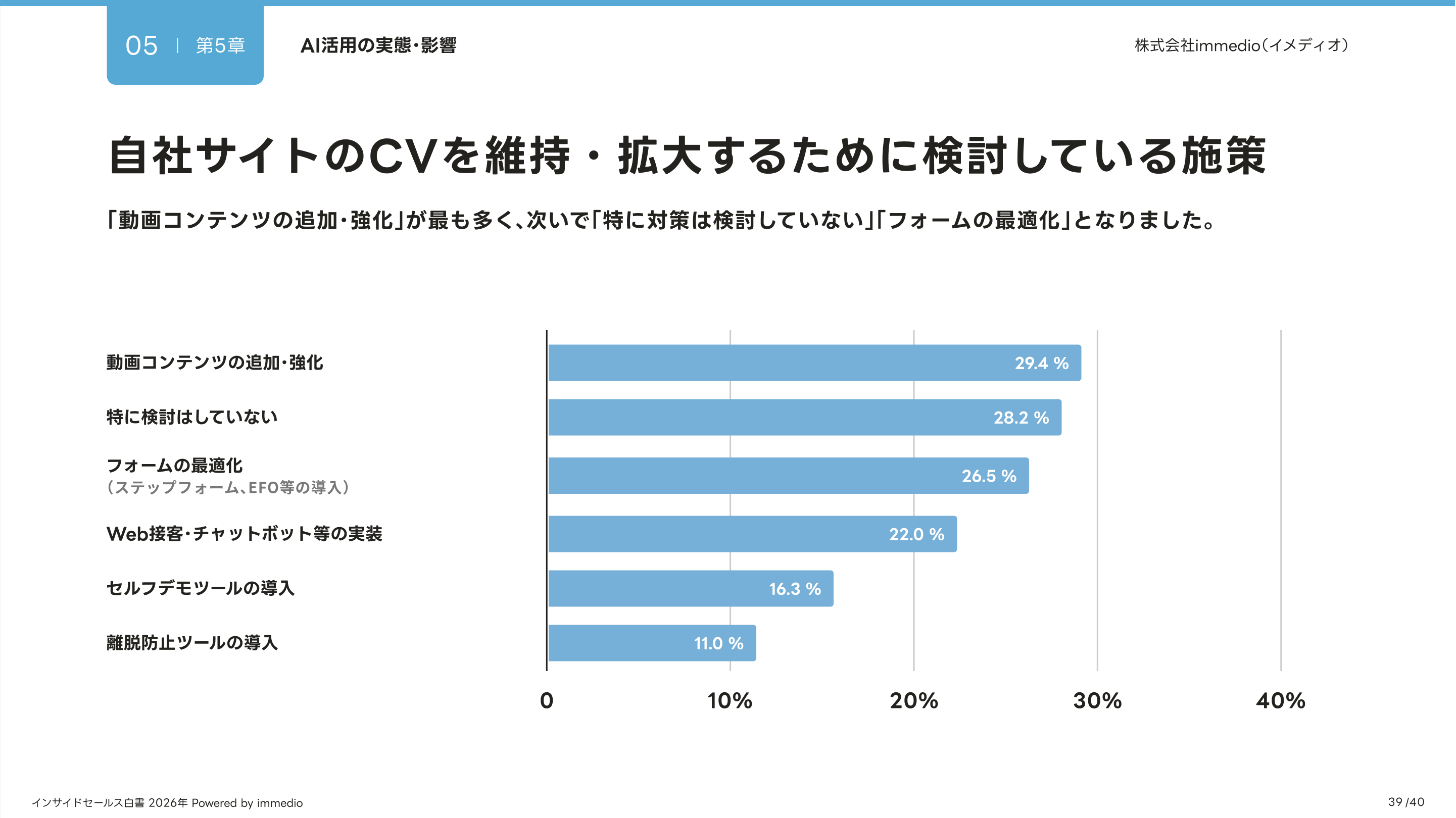 インサイドセールス白書2026では、上記に加え、オーガニック検索による自社サイト流入の変化や、自社サイトのCVを維持・拡大するために実施・検討している施策などの調査データを収録しています。
